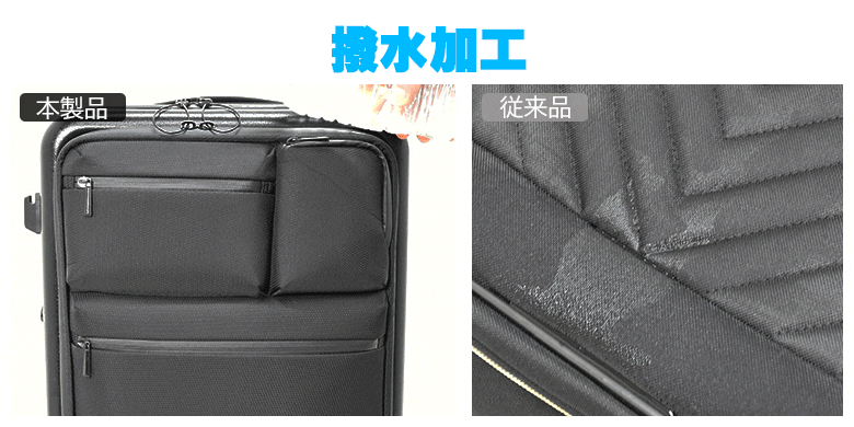 ハードタイプのスーツケースなのに前面は布素材ですぐに収納できるフロントポケットや止水ファスナーなど今までにない機能満載の多機能ハイブリッドスーツケースを開発しました。