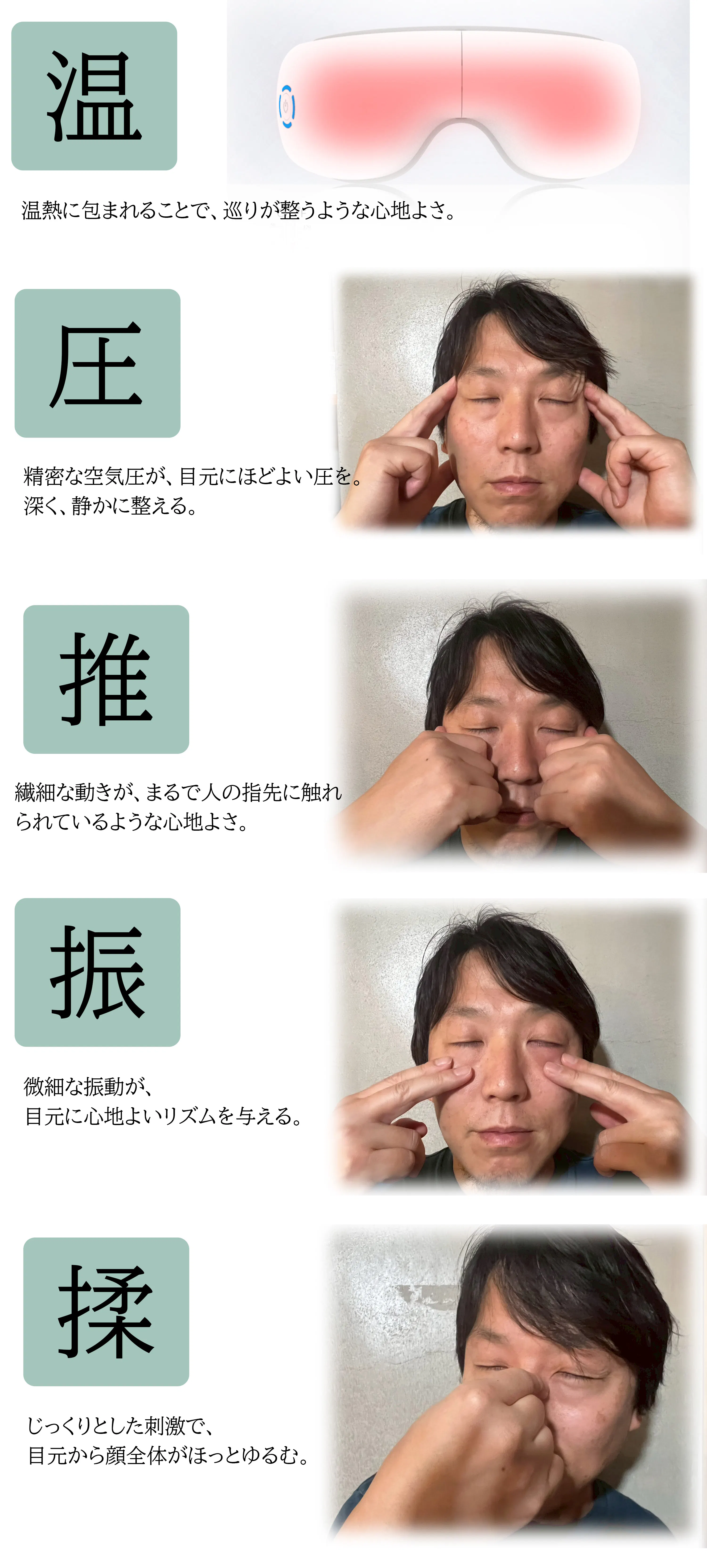 上下・内外からの空気圧により、目元を優しく包み込むように加圧。その感覚は、まるで熟練の手技。圧の強弱や動きが絶妙で、目の周囲を柔らかくほぐしながら深い安らぎへ。