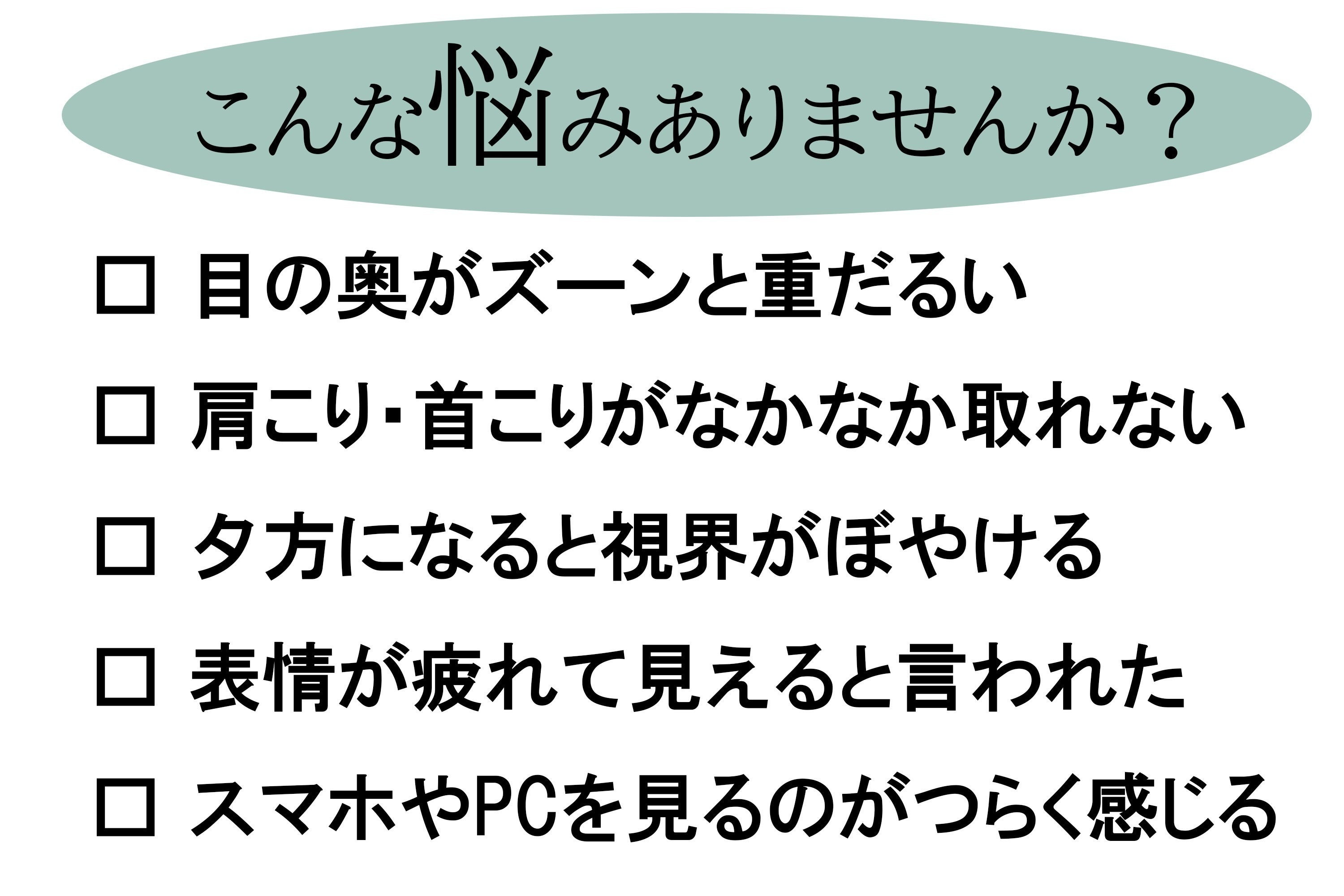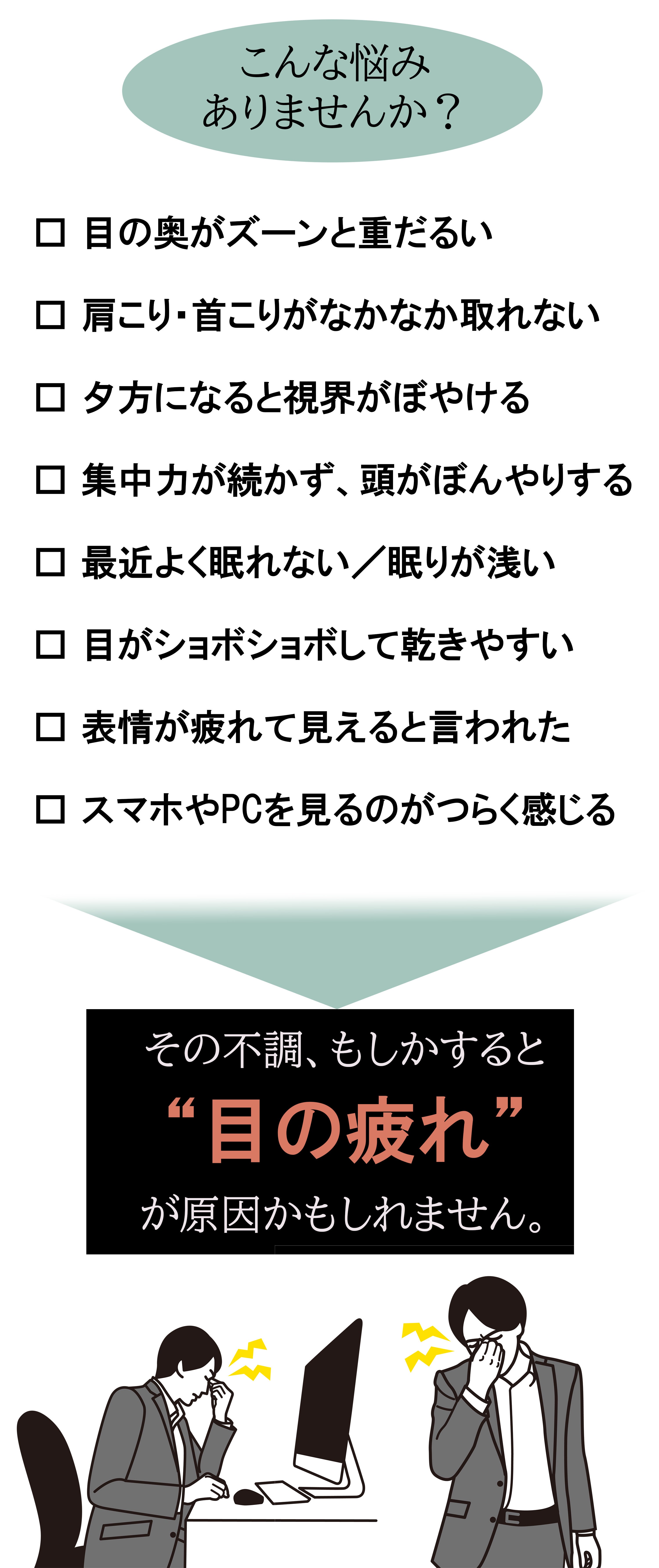 目の奥が重い、まぶたがピクピクする、肩がこる、眠りが浅い、イライラする…。それは“眼精疲労”からくる、全身の不調のサインかもしれません。