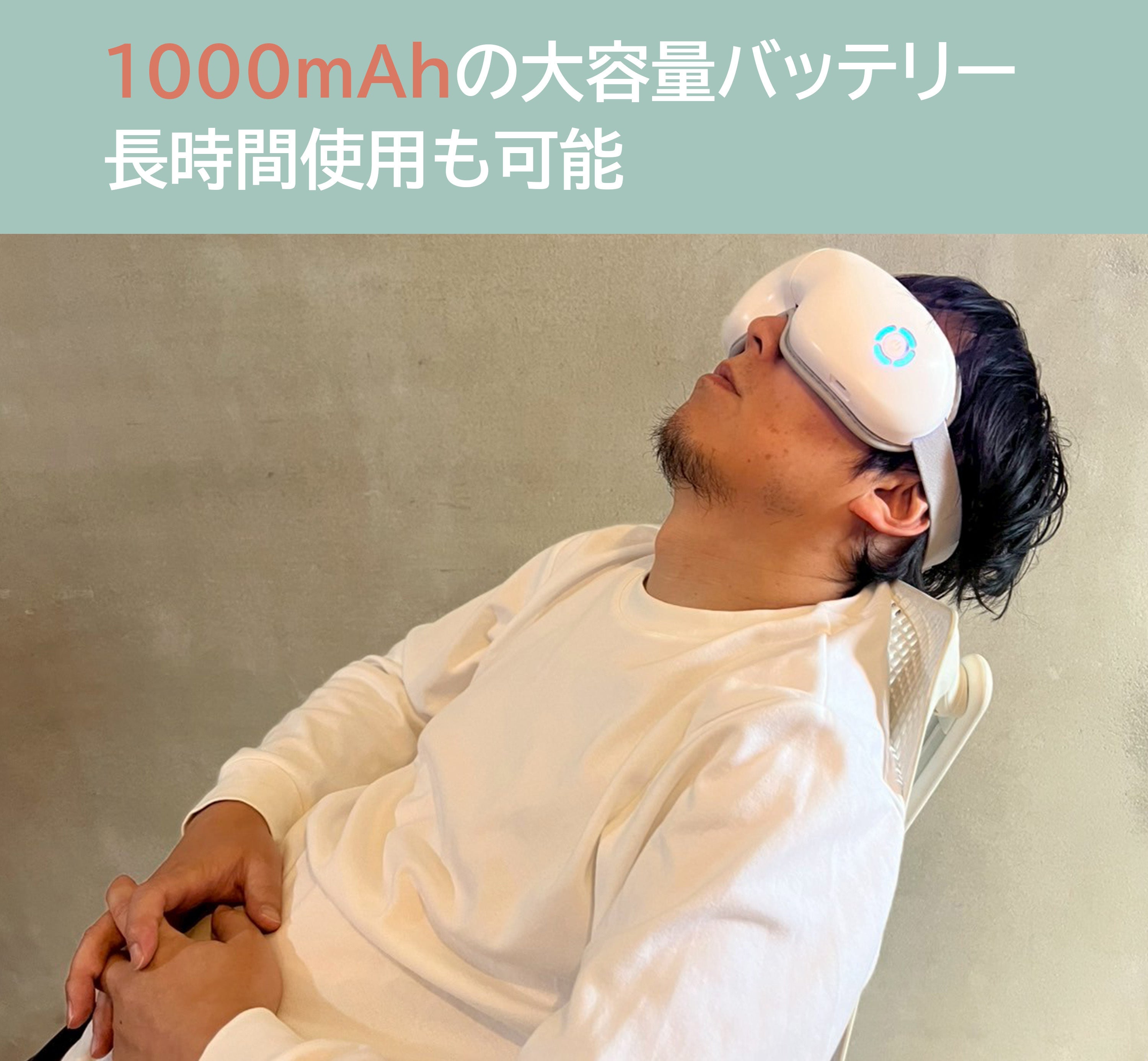 NEURO EYEには、1000mAhの大容量バッテリーを搭載。一度の充電で、数回分の使用が可能な設計になっているため、毎日忙しい方でもこまめな充電の手間なく、ストレスフリーでお使いいただけます。