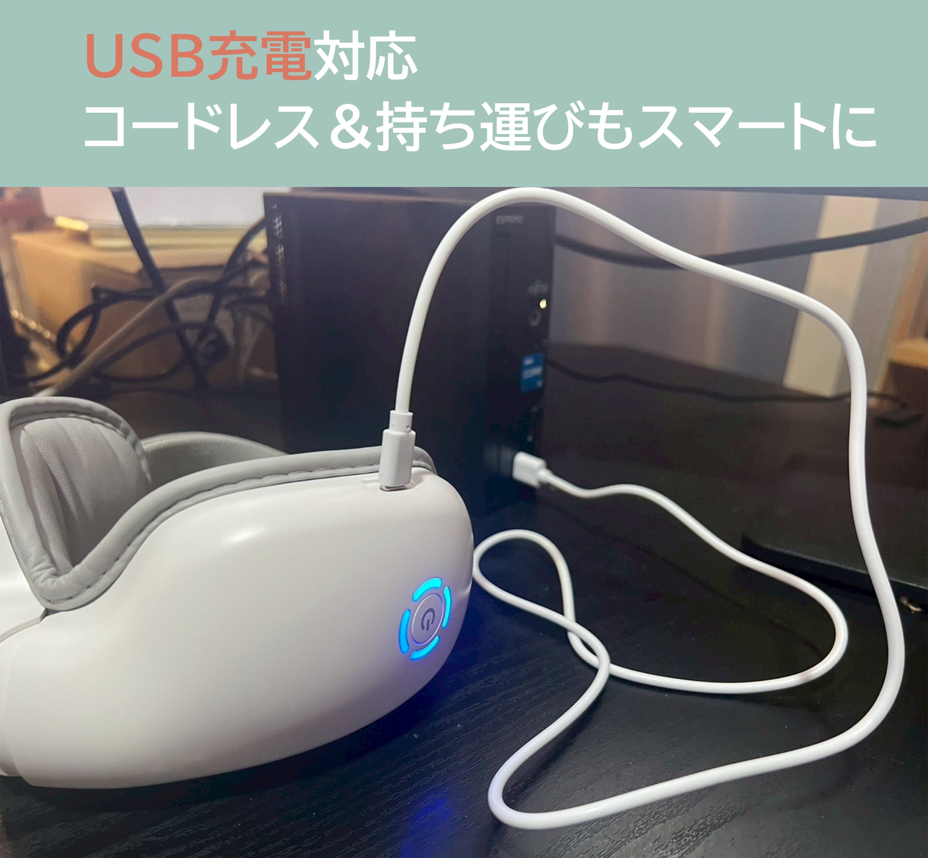 NEURO EYEは、USB充電式&コードレス仕様。煩わしいケーブルに縛られることなく、好きなときに、好きな場所で、自由に使える快適さを実現しました。