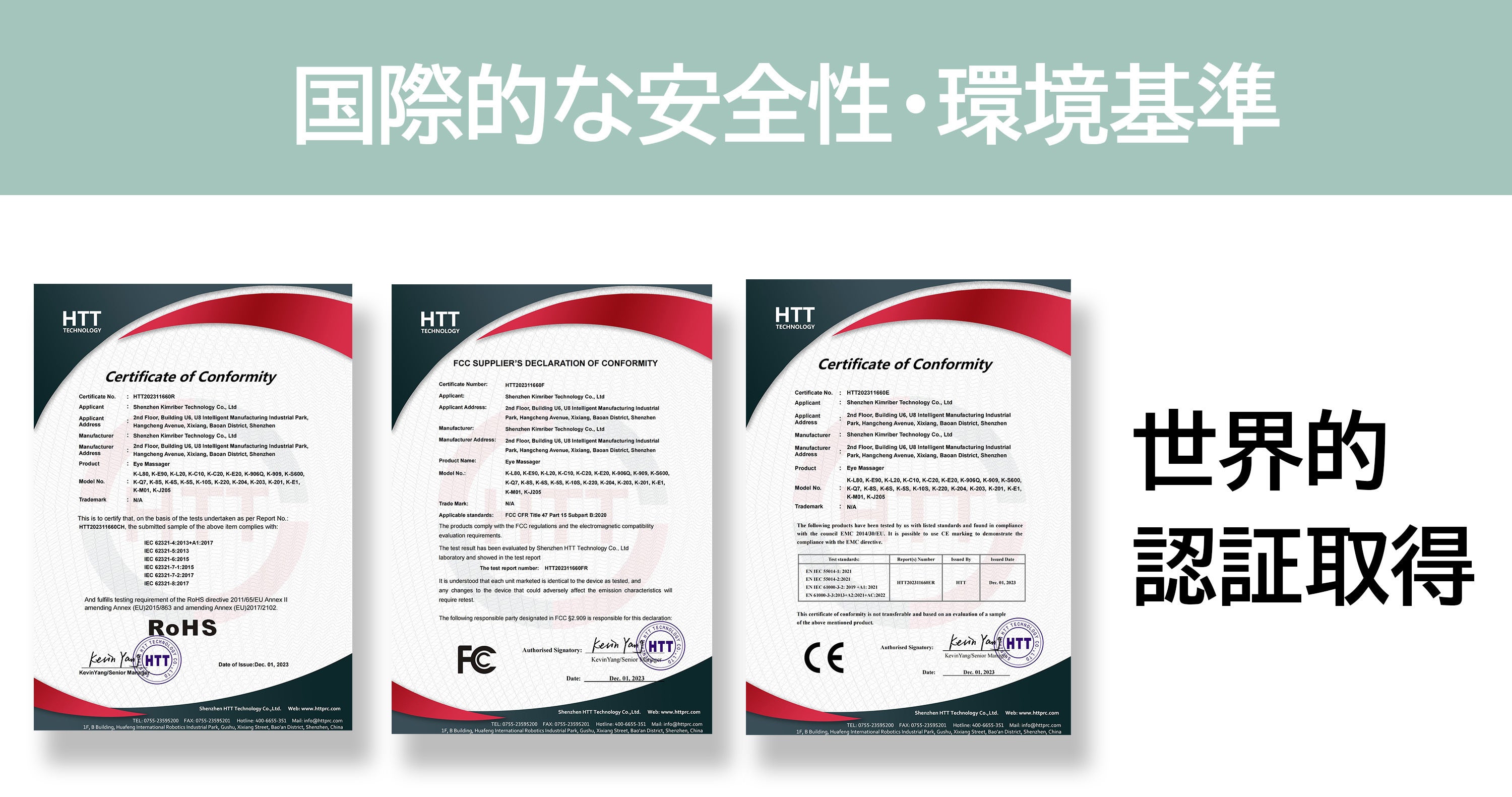 本製品は、国際的な安全性・環境基準を満たす証である『FCC』『CE』『RoHS』の各認証を取得済み。