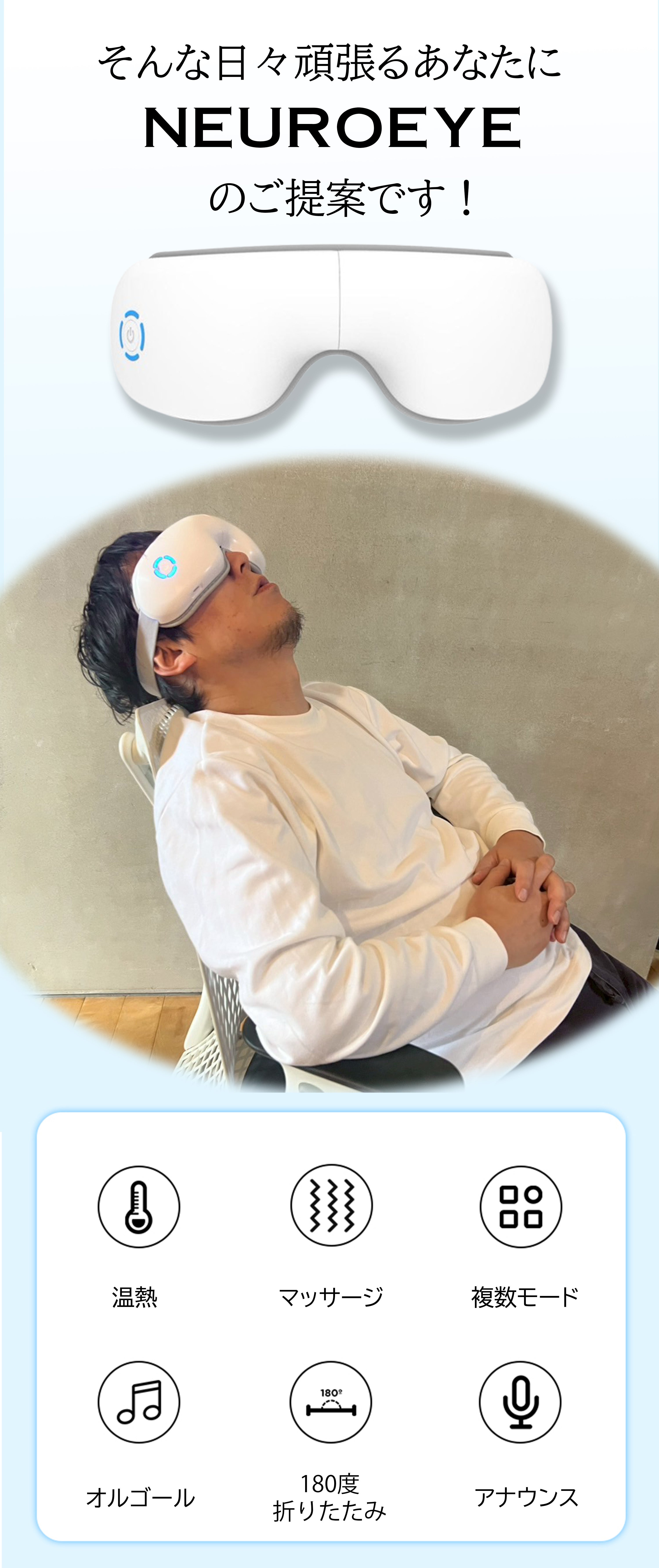 目元をケアすることで、思考がクリアになり、不思議と気分まで軽くなる。NEURO EYEは、そんな“根本からのリセット”を目指したリラクゼーションギアです。