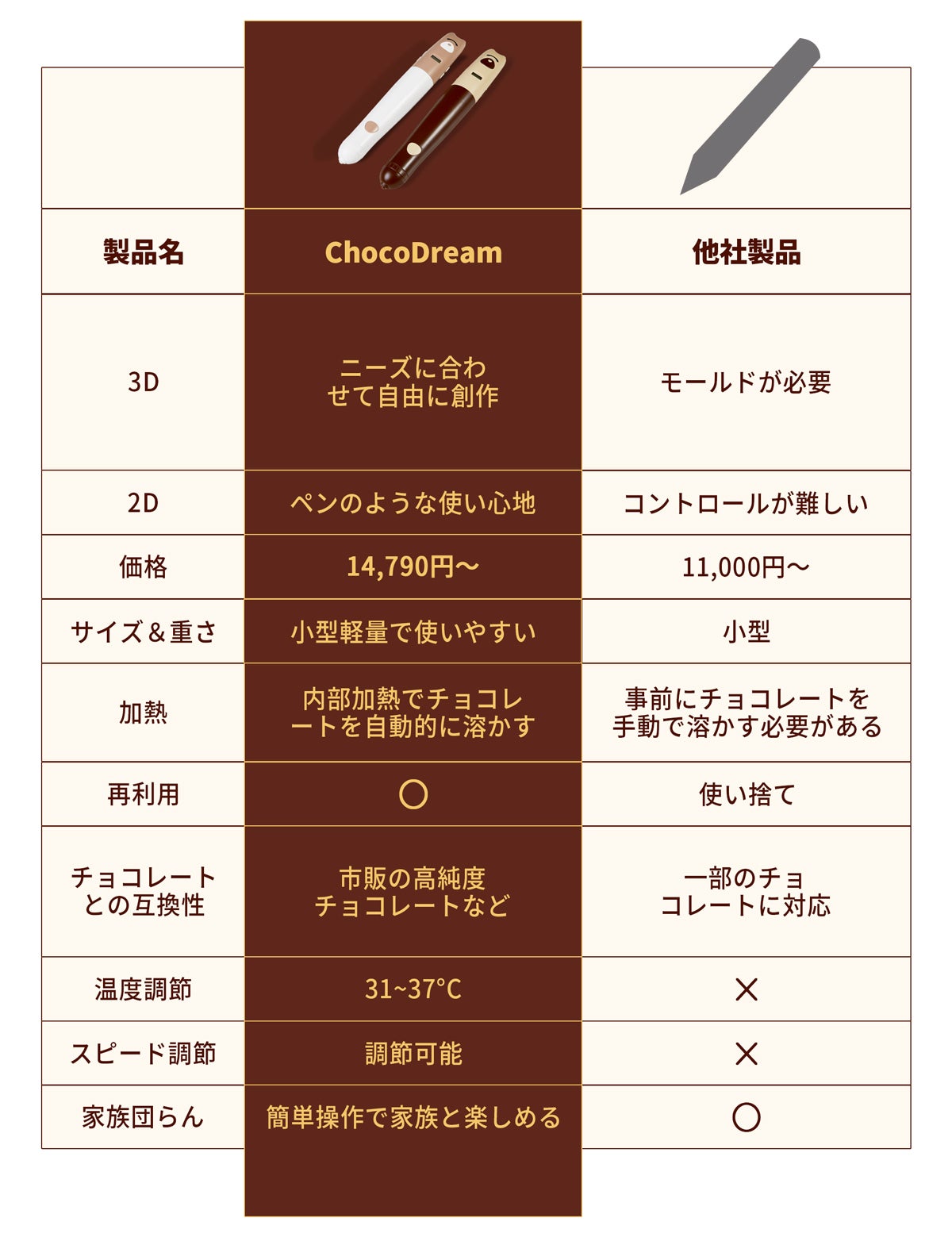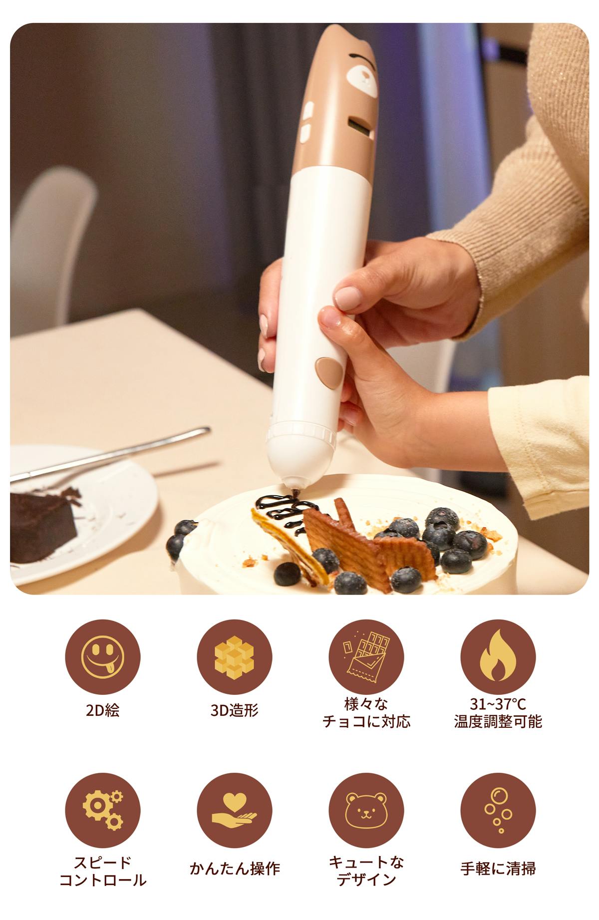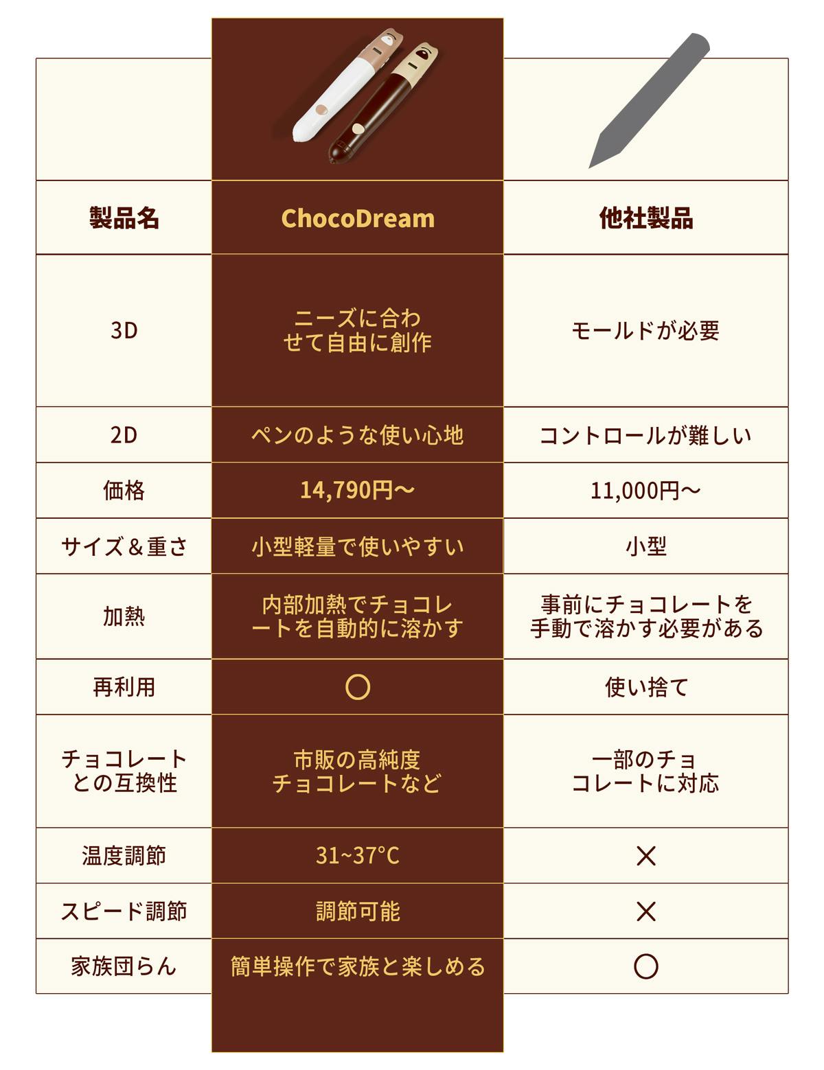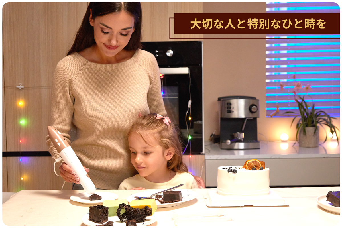 「ChocoDream(チョコドリーム)」は、あなたのあらゆる想像をチョコレートで形にする、立体的に文字や模様が描ける世界初の3Dチョコレートプリントペンです。型やテンプレートに頼らず、3Dプリントペン感覚で自由にチョコレートアートや立体作品を作れるのがポイント!3Dの力でお菓子づくりの楽しさがぐっと広がり、今までにないお菓子づくり体験を!