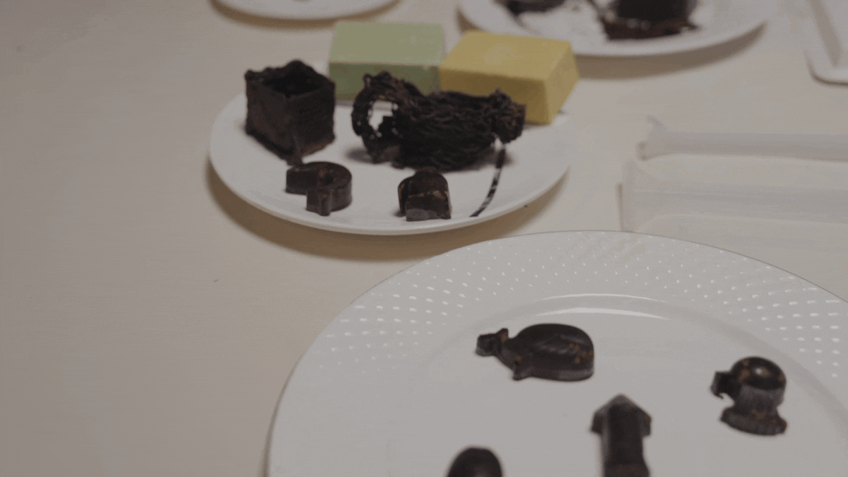 樹脂が素材の3Dプリントペンのように、「ChocoDream」はチョコレートを程よく溶かし、滑らかに1層1層積み上げていくことで、高さのある造形物を出力できます。様々な3Dパーツを作り、組み合わせて1つのチョコレートアートを制作することも可能!