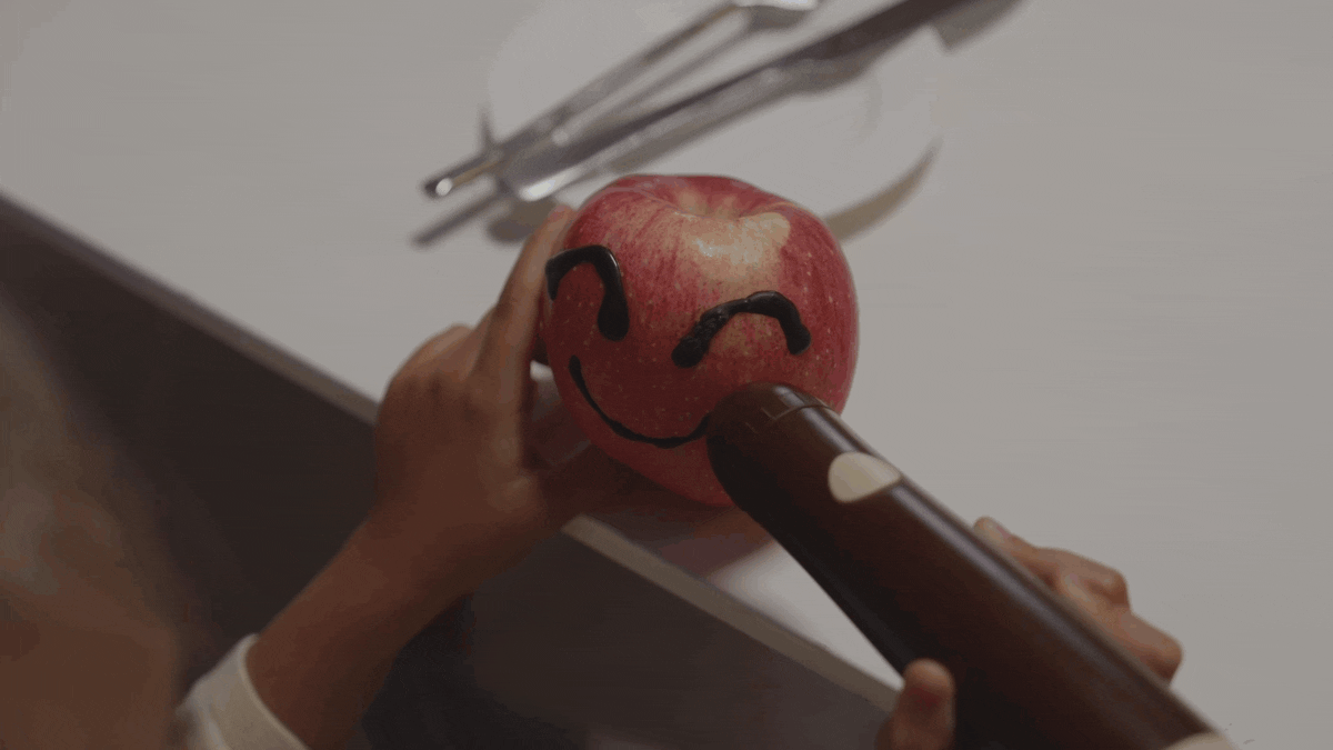 3Dアートのほか、誕生日ケーキの上に書くメッセージやリンゴの表面に描くスマイル模様などの2Dデザインにも対応。「ChocoDream」を使うことで、一つ一つのお菓子に命が宿る感動を体感することが可能。