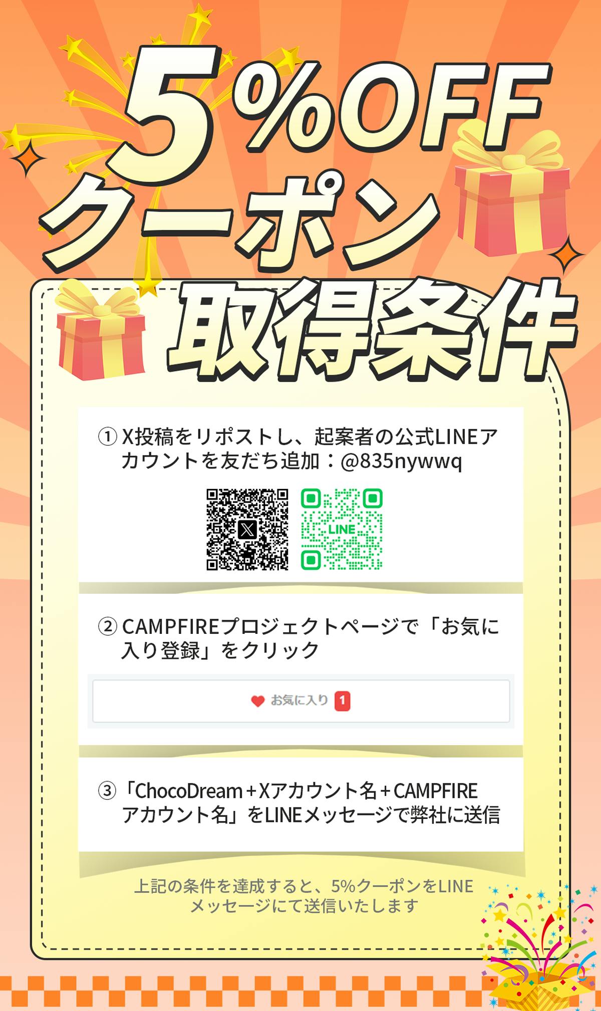 2025/12/26 15:04支援者の皆様お世話になっております。この度はプロジェクトページをご覧いただき、誠にありがとうございます。3Dチョコレートプリントペン「ChocoDream」プロジェクトスタート!今だけの特典公式LINEを追加&X(旧Twitter)の投稿をリポストで5%OFFクーポンをプレゼント!~ストレッチゴールキャンペーン実施中~支援者の皆様への感謝を込めて、ストレッチゴールキャンペーンも開催中です!参加条件:1.本X投稿をリポストし、起案者の公式LINEアカウントを友だち追加2.ご注文時のメモ欄にXアカウント名を記載していること商品についてご質問、ご不明な点がございましたら、お気軽にご連絡ください。目標達成に向けて頑張りますので、どうぞよろしくお願いいたします!合同会社0&1 もっと見る