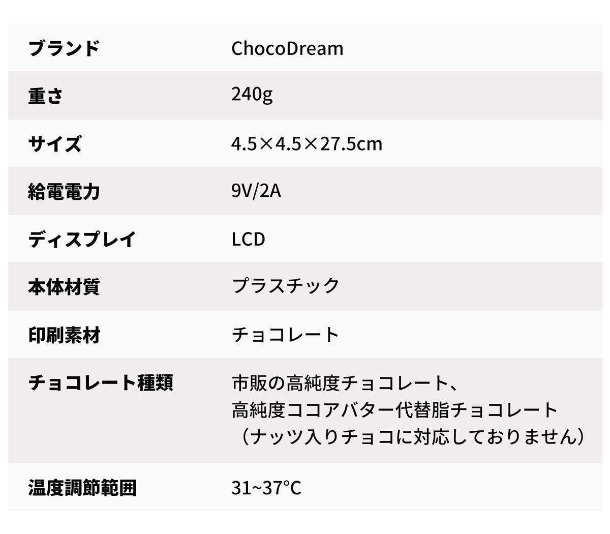 大きなパワーに大きな互換性を。「ChocoDream」は、ダークチョコレートなどの高純度チョコレートや高純度ココアバター代替脂チョコレートに対応(※ナッツ入りチョコレートには対応しておりません)。市販の様々なチョコレートをそのまま細かく切ってチューブに入れられるため、専用チョコや特別な材料の準備は不要。