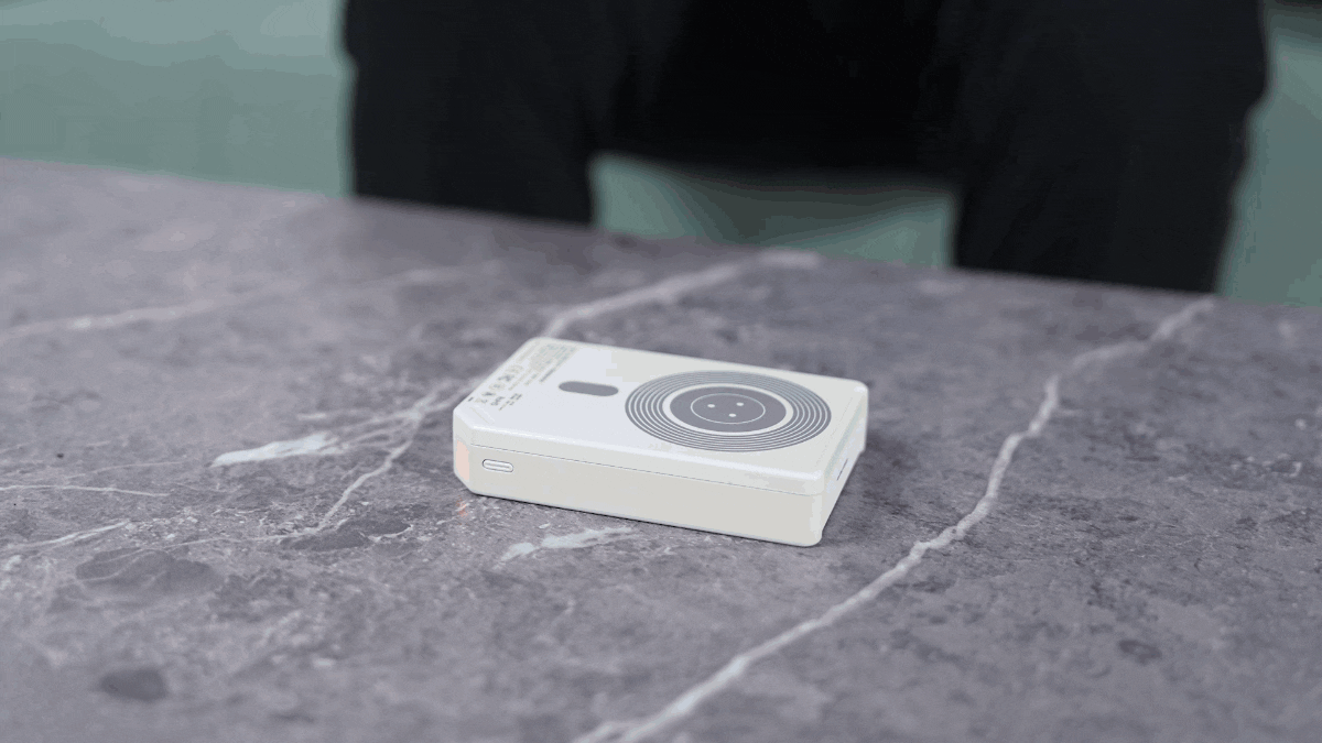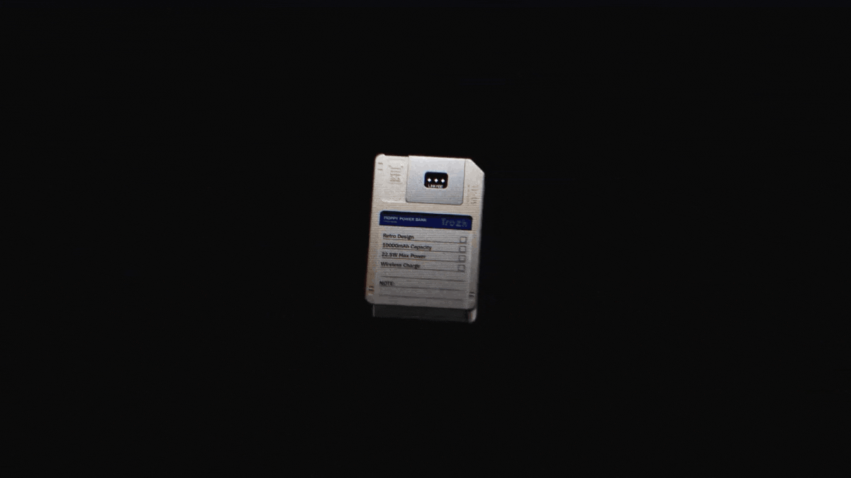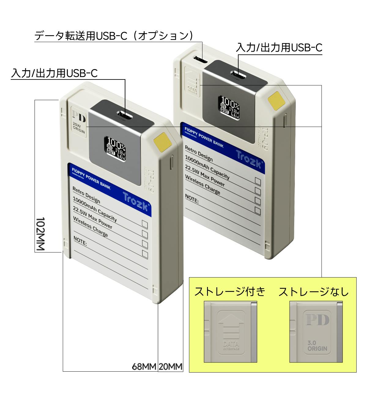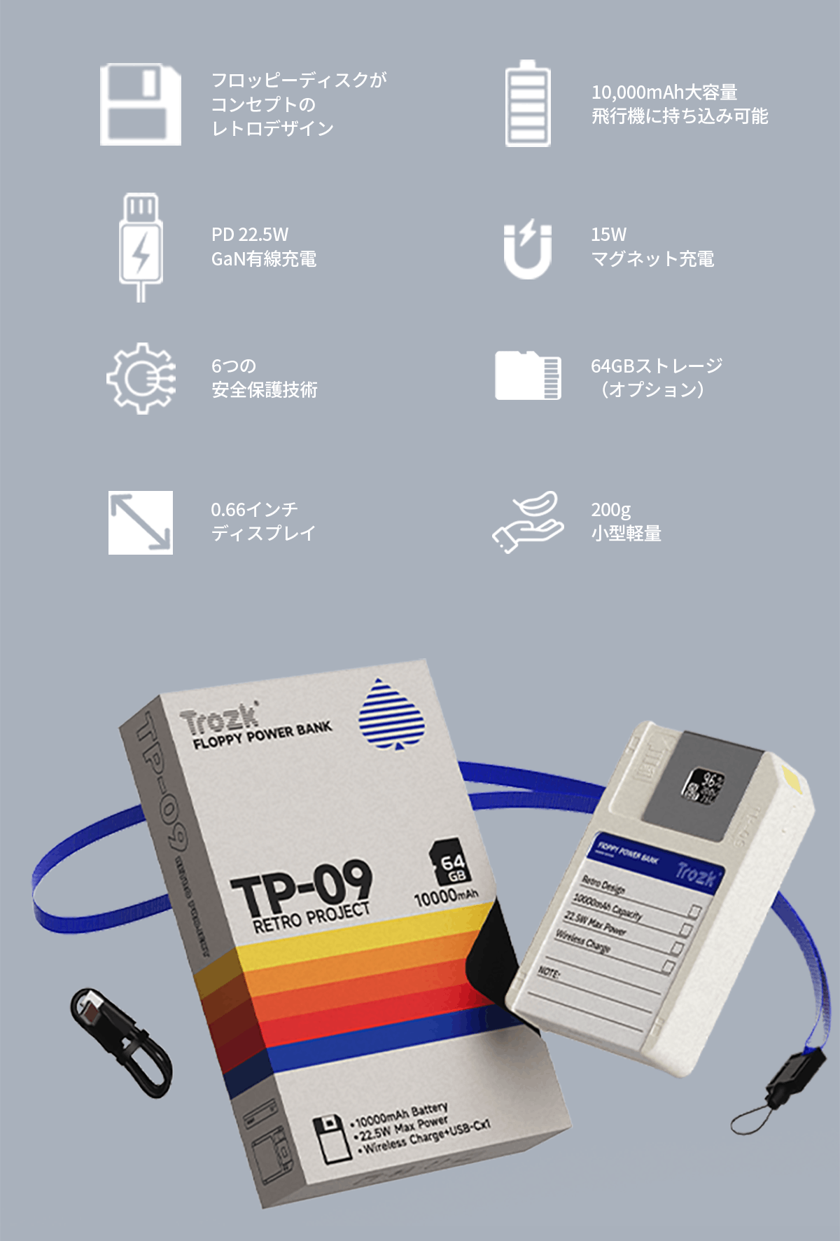 「TP09」はフロッピーディスク(FD)をモチーフにしたレトロなデザインをしているコンパクトモバイルバッテリーです。重さはわずか200g超軽量でありながら、10,000mAhの大容量に加え、マグネット式無線充電(15W)とUSB-C有線急速充電(PD 22.5W)にも対応。さらに、64GBストレージ内蔵(オプション)で、USB 3.2 Gen1の高速USBメモリーとしても利用できるのもポイント。