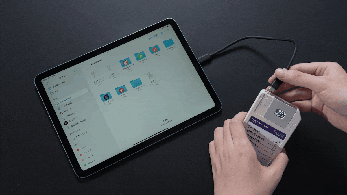 64GBストレージ(オプション)が内蔵されており、モバイルバッテリーのほか、USB 3.2 Gen1(約150MB/s)対応のUSBメモリーとしても大活躍。スマホで撮影したあと、「TP09」でスマホに無線充電しながら、撮った写真や動画などを「TP09」のストレージにスムーズに転送することが可能!