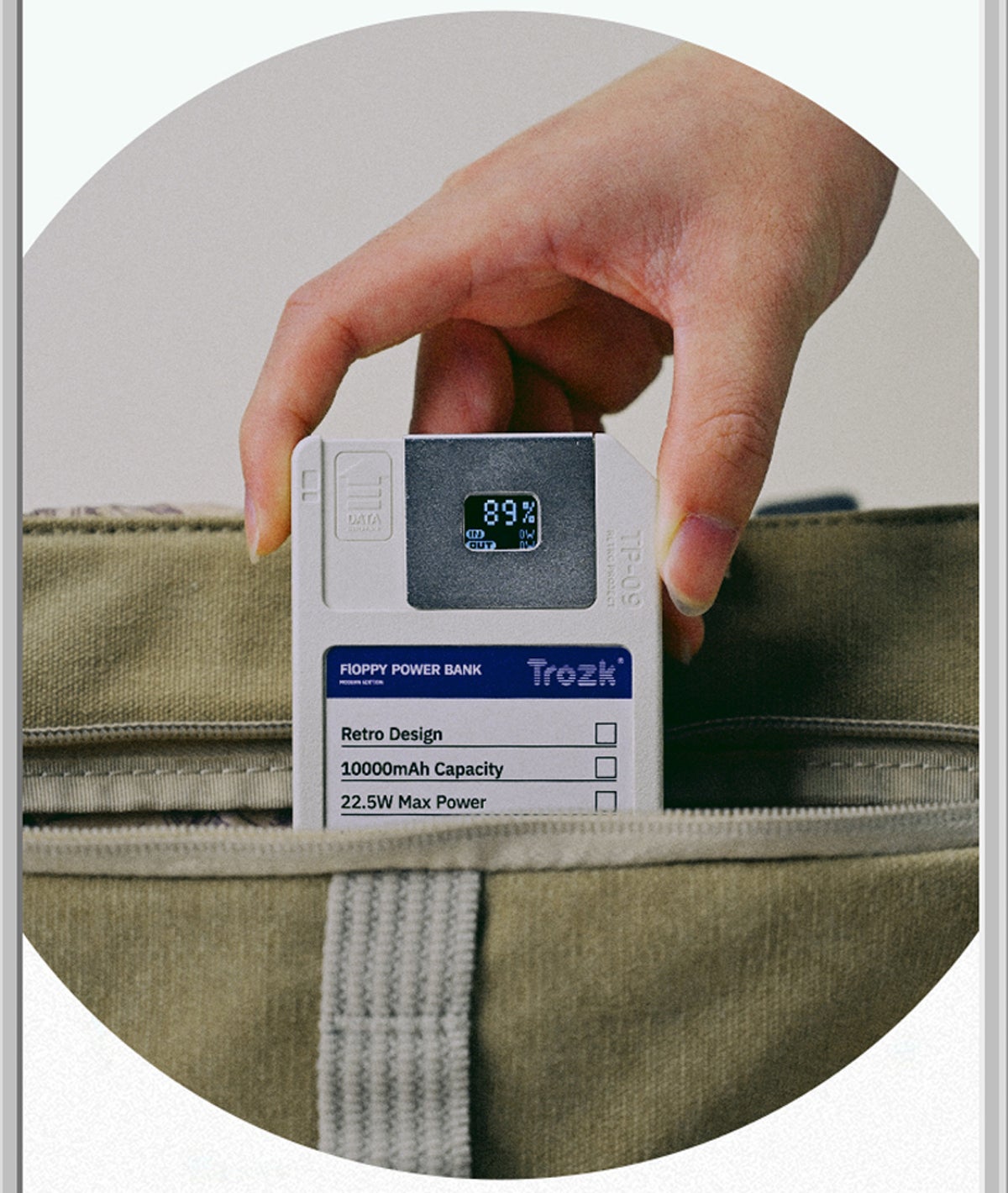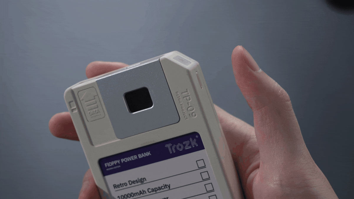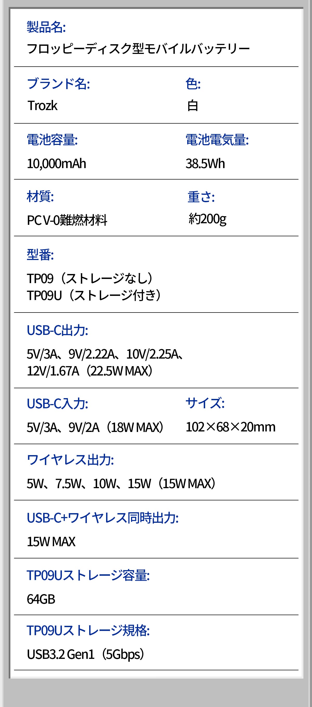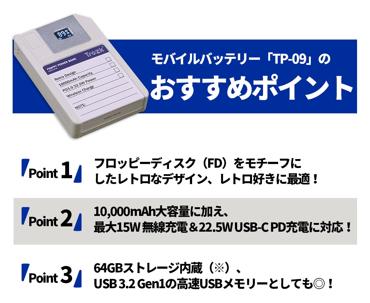 「TP09」はフロッピーディスク(FD)をモチーフにしたレトロなデザインをしているコンパクトモバイルバッテリーです。重さはわずか200g超軽量でありながら、10,000mAhの大容量に加え、マグネット式無線充電(15W)とUSB-C有線急速充電(PD 22.5W)にも対応。さらに、64GBストレージ内蔵(オプション)で、USB 3.2 Gen1の高速USBメモリーとしても利用できるのもポイント。