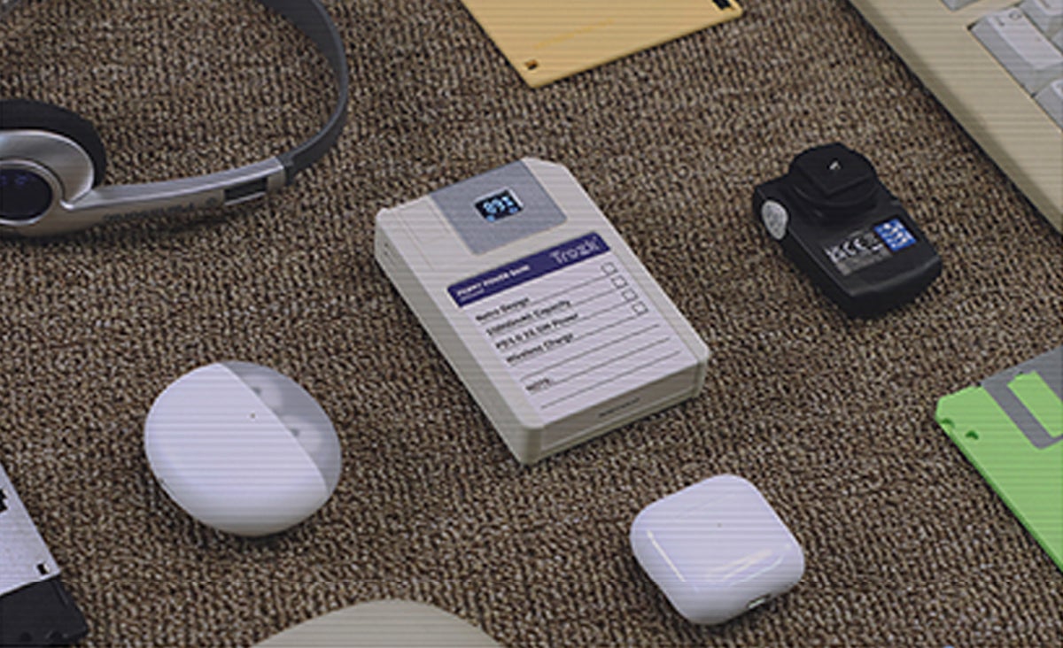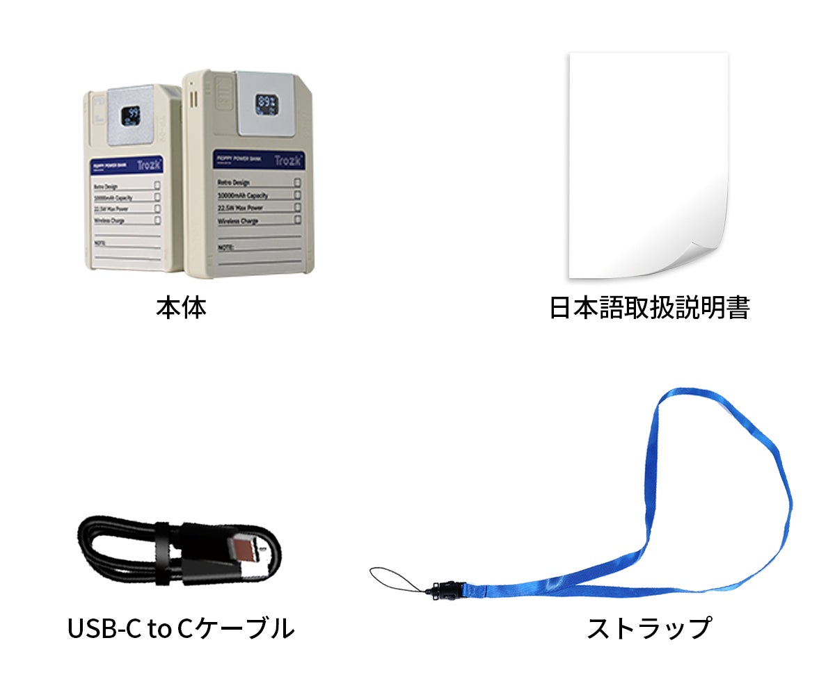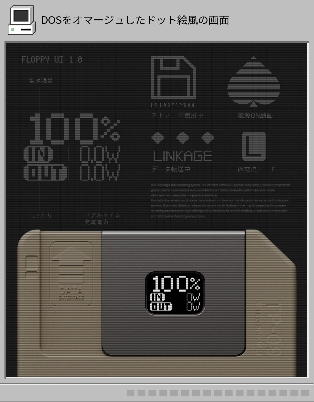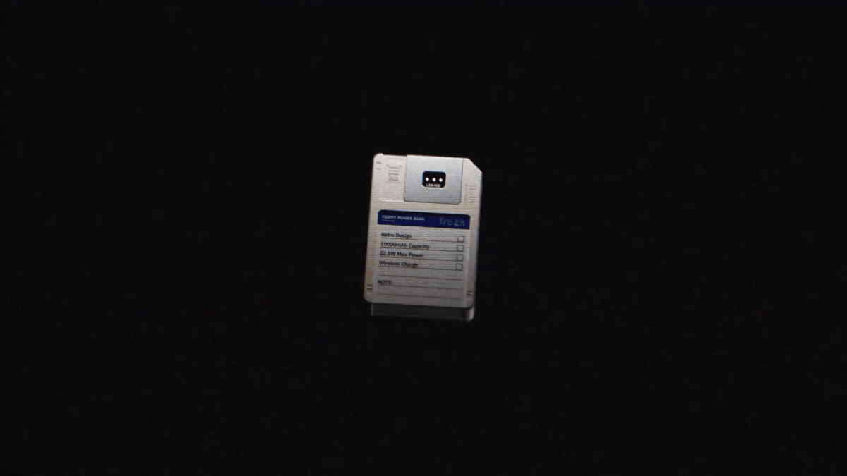 「TP09」はフロッピーディスク(FD)をモチーフにしたレトロなデザインをしているコンパクトモバイルバッテリーです。重さはわずか200g超軽量でありながら、10,000mAhの大容量に加え、マグネット式無線充電(15W)とUSB-C有線急速充電(PD 22.5W)にも対応。さらに、64GBストレージ内蔵(オプション)で、USB 3.2 Gen1の高速USBメモリーとしても利用できるのもポイント。