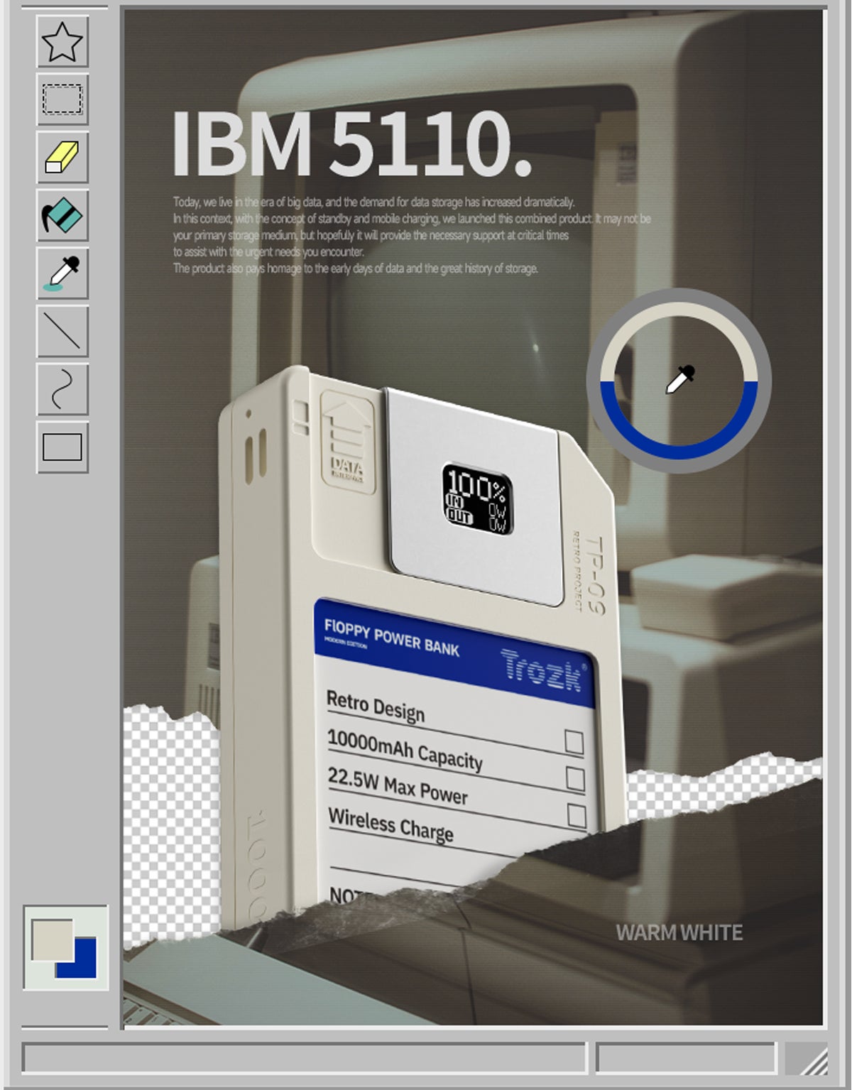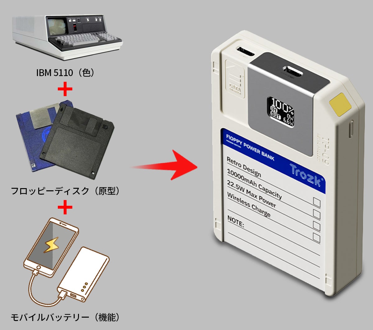 「TP09」はあの頃の感動を再び感じていただけるように、フロッピーディスクをモチーフに設計され、色も世界初のフロッピーディスクを搭載したPCの一つ「IBM 5110」の白を採用、あの時代の風格を忠実に再現。