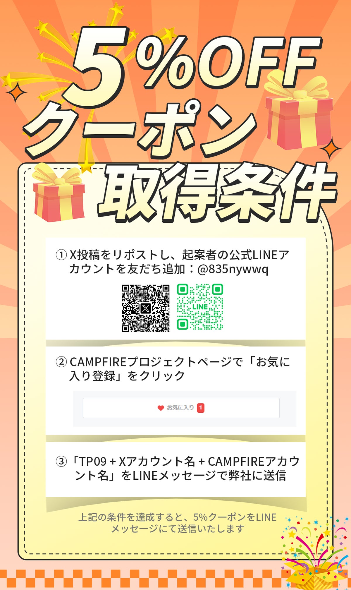 ●その他記載事項:プロジェクトページ、リターン記載欄、共通記載欄(https://camp-fire.jp/legal)をご確認ください。
