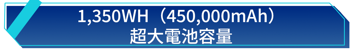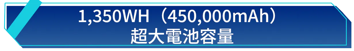 さらに、最大2,400W出力対応、13口(5種類)の出力ポート搭載、1,350Wh(450,000mAh)大容量内蔵など魅力的なポイントが満載されているのもポイント!