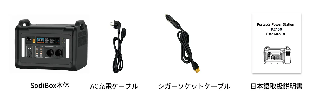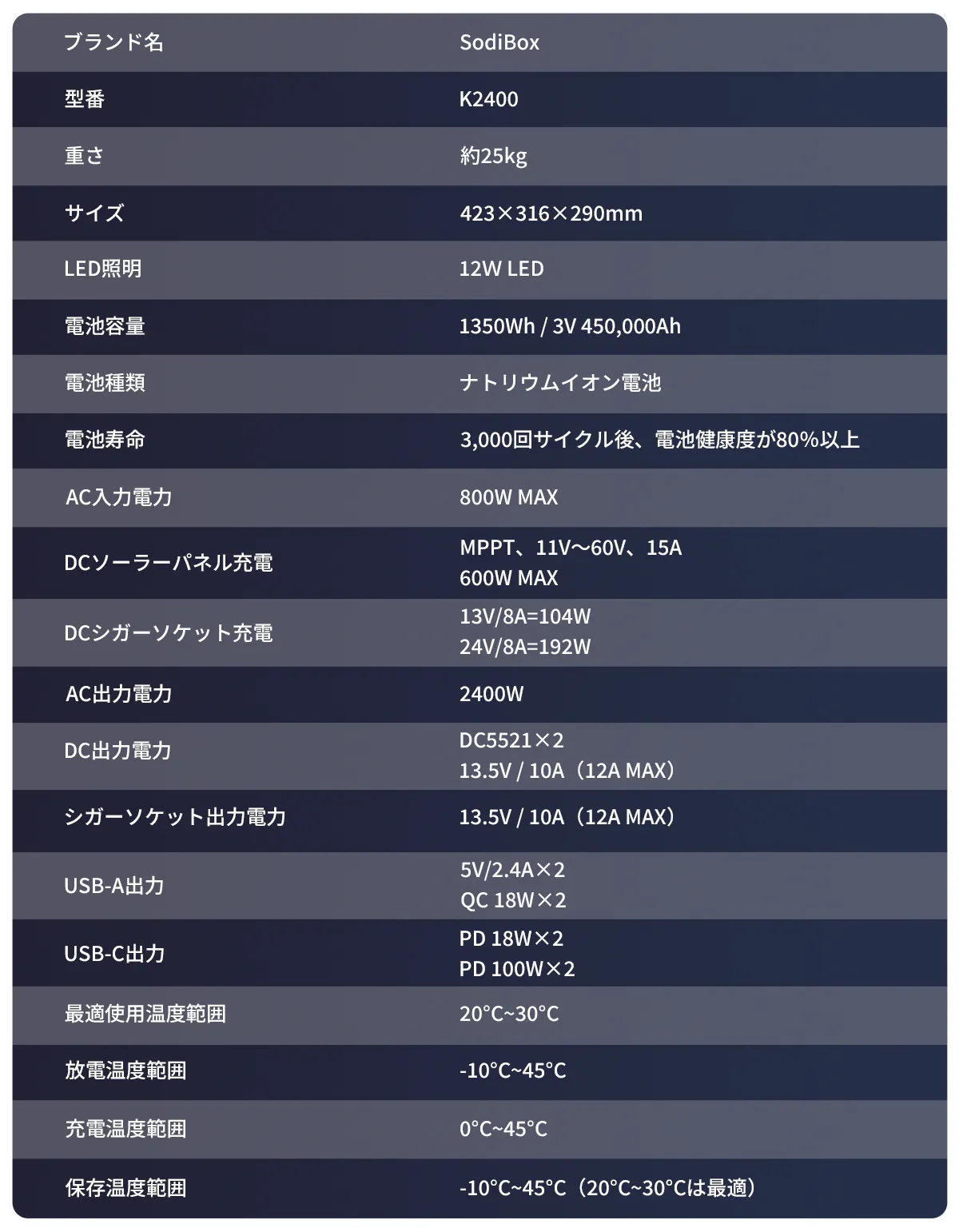 「SodiBox(ソディボックス) K2400」は一般的なポータブル電源に搭載されることが多いリチウムイオン電池ではなく、ナトリウムイオン電池を使用した世界初のナトリウムイオンポータブル電源※です。