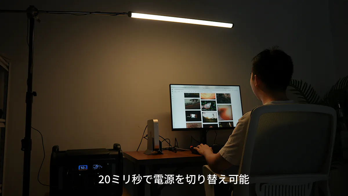 パソコンなどを「SodiBox」を介してご自宅のコンセントに接続している場合、もし停電が起きたら、PCの給電元は20ミリ秒以内にコンセントから「SodiBox」に切り替わり、停電によるPCのシャットダウン・データの紛失などを未然に防ぎます。