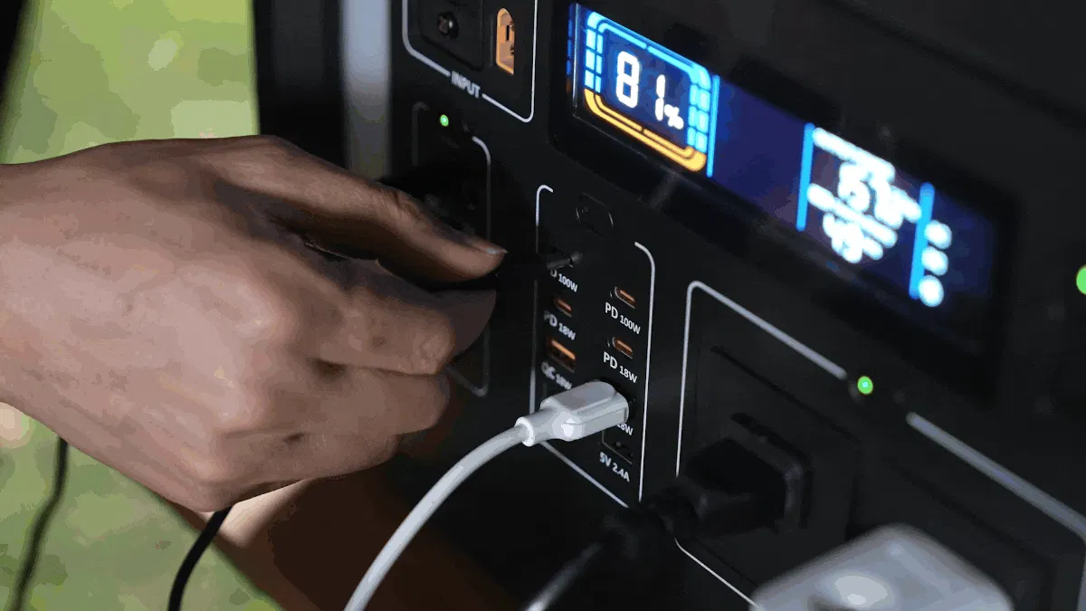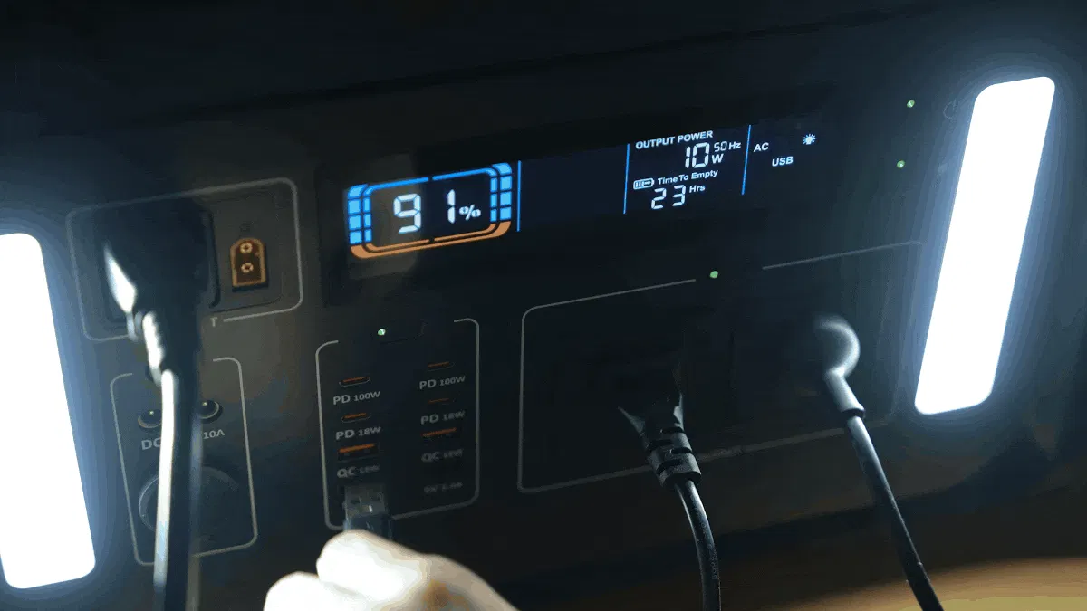 出力ポートの豊富さも見逃せません。AC出力ポート2口(2,400W)に加えて、USB-Aポート4口(QC 18W×2、5V/2.4A×2)、USB Type-Cポート4口(PD 18W×2、PD 100W×2)、シガーソケット1口(13.5V/10A)、DC出力ポート2口(13.5V/10A 12A MAX)も搭載されており、冷蔵庫などの大型電器からスマホのような小型デバイスまで幅広いデバイスに対応。🔌