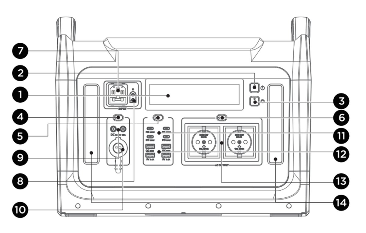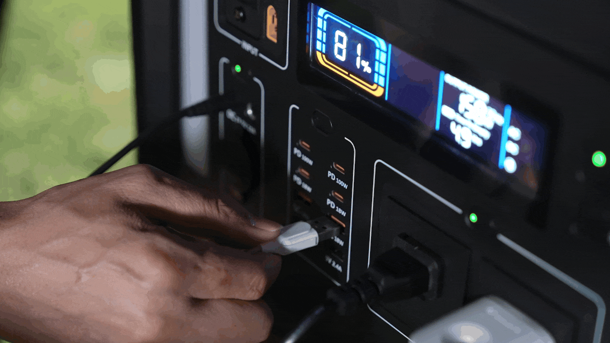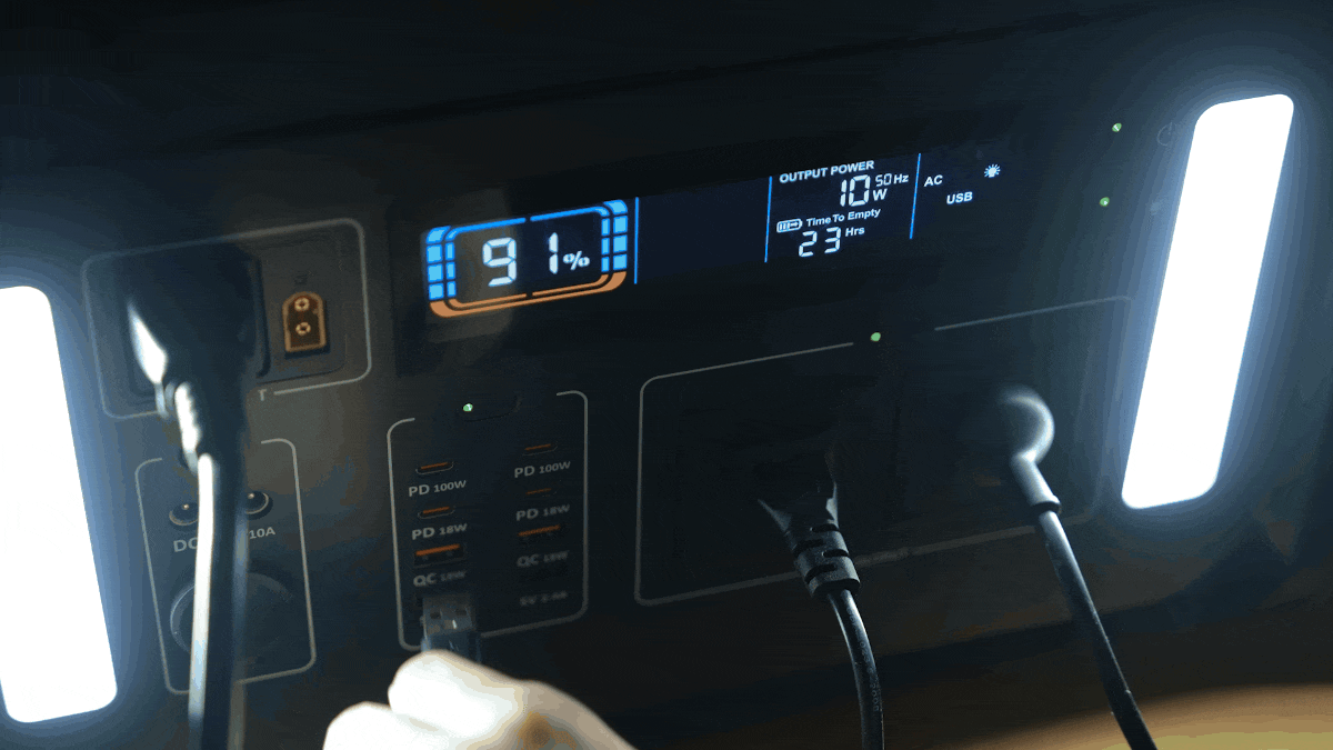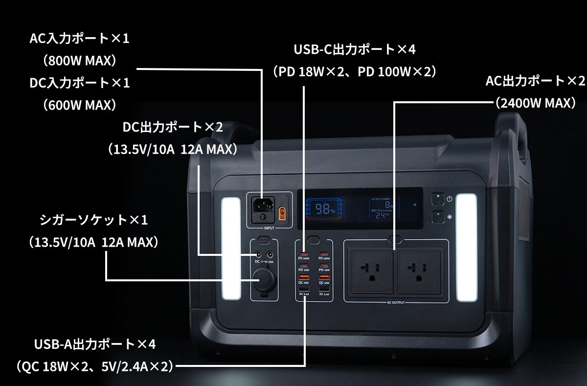 出力ポートの豊富さも見逃せません。AC出力ポート2口(2,400W)に加えて、USB-Aポート4口(QC 18W×2、5V/2.4A×2)、USB Type-Cポート4口(PD 18W×2、PD 100W×2)、シガーソケット1口(13.5V/10A)、DC出力ポート2口(13.5V/10A 12A MAX)も搭載されており、冷蔵庫などの大型電器からスマホのような小型デバイスまで幅広いデバイスに対応。🔌