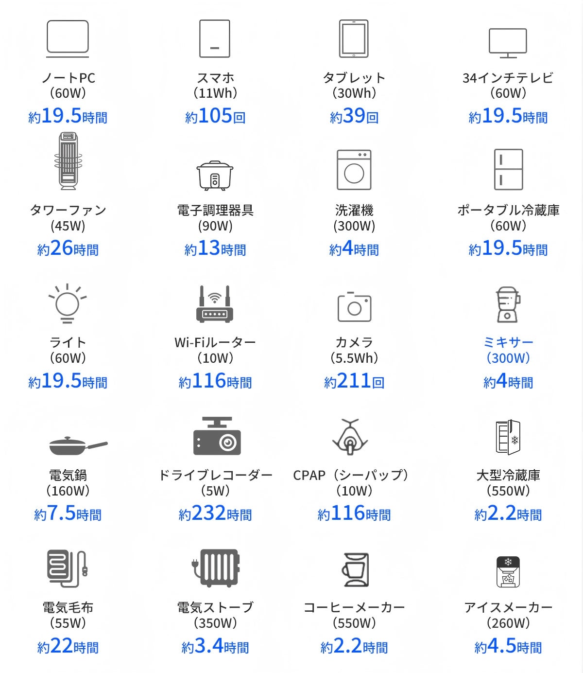 見た目は小さいですが、1,350WH(450,000mAh)もの超大電池容量を内蔵!スマホやタブレットへの充電などはもちろん、消費電力が550Wの大型冷蔵庫でも約2.2時間稼働させることが可能!🔋