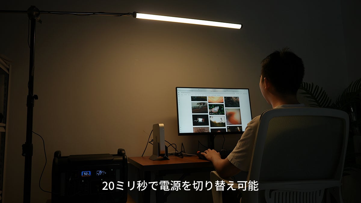 パソコンなどを「SodiBox」を介してご自宅のコンセントに接続している場合、もし停電が起きたら、PCの給電元は20ミリ秒以内にコンセントから「SodiBox」に切り替わり、停電によるPCのシャットダウン・データの紛失などを未然に防ぎます。