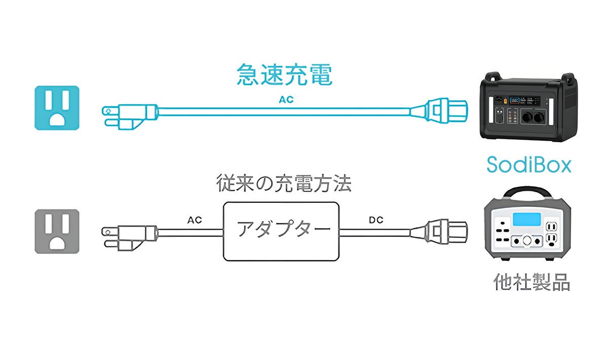 「SodiBox」では独自開発した急速充電技術を採用、従来のACアダプターを介する遅い充電とは異なり、付属のケーブル1本で急速充電可能。AC充電入力は最大で800W、わずか2.2時間でフル充電できます。💨