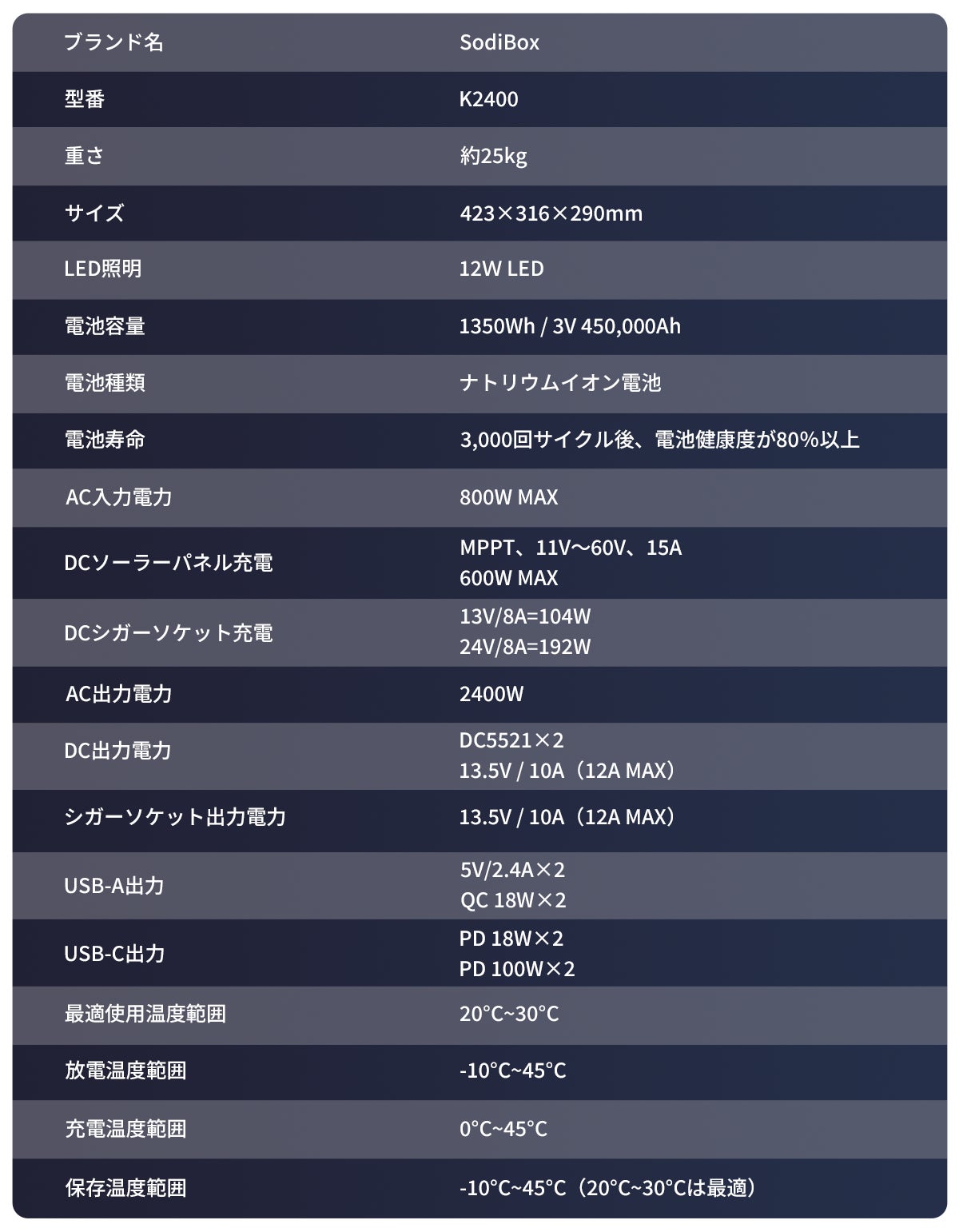 ほとんどのリチウムイオンポータブル電源の温度範囲が0~40°Cであるのに対して、ナトリウムイオン電池を採用したため、「SodiBox」の使用可能な温度範囲は-10~45°Cです。☀️「SodiBox」があれば、過酷な環境による出力停止を心配することなく、猛暑日も厳寒日も気軽に乗り越えられます!❄️