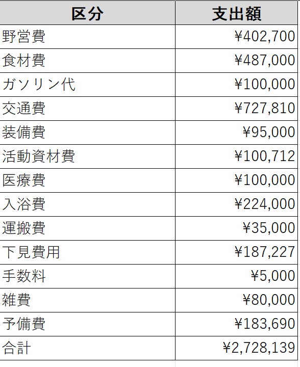 • 合宿の費用 (キャンプ場代、食費、レンタカー代、入浴費など)