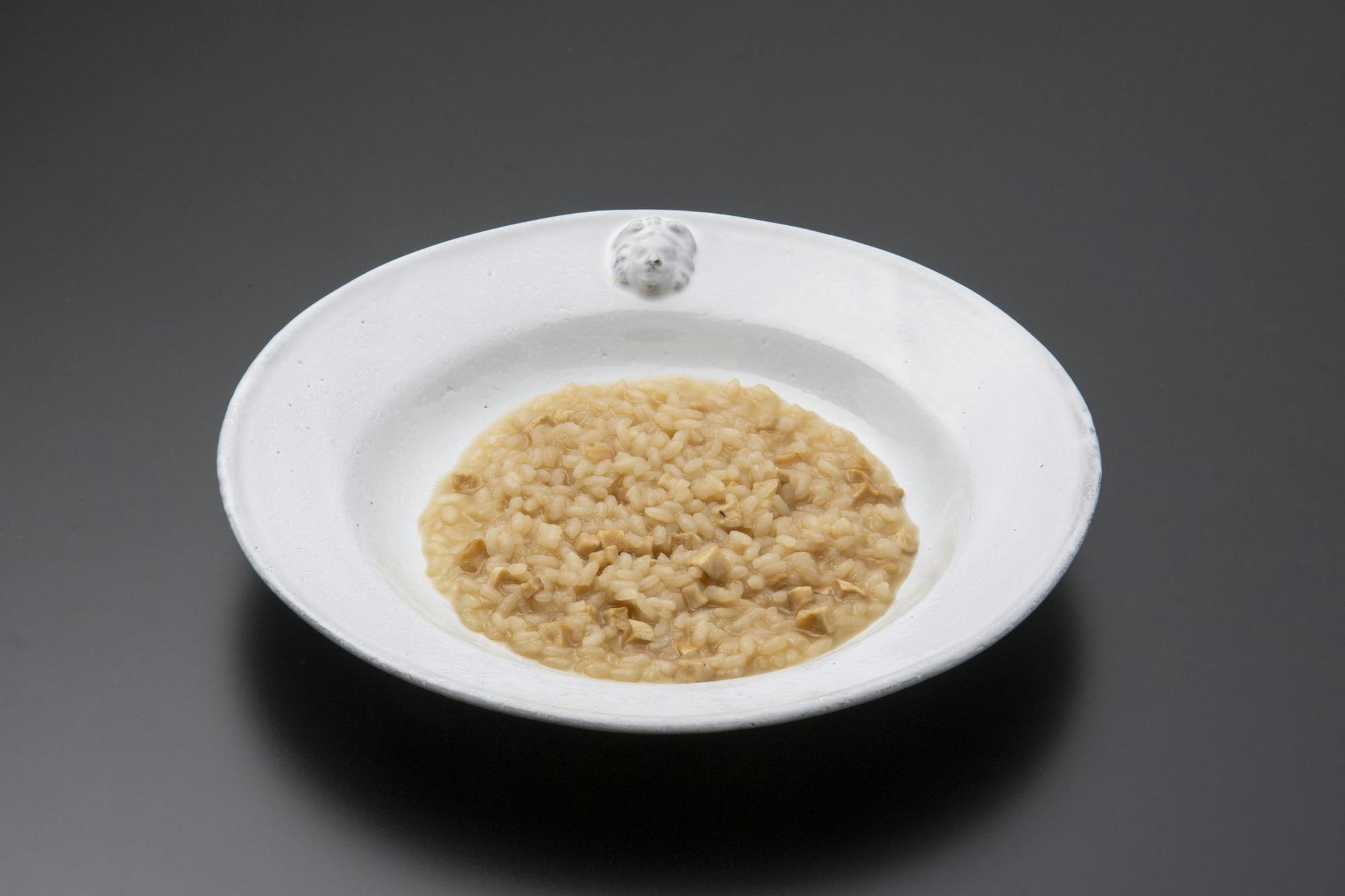 スペシャリテである「椎茸リゾット」の材料は、しいたけ、米、水、塩、米油のみ。出汁も、フレッシュなしいたけと水のみで、短時間で仕上げ。米ぬかから作られる米油は、米の味を邪魔しません。極限までシンプルな構成で、味を組み合わせるのではなく、単一素材の持ち味を引き出すことに特化しています。