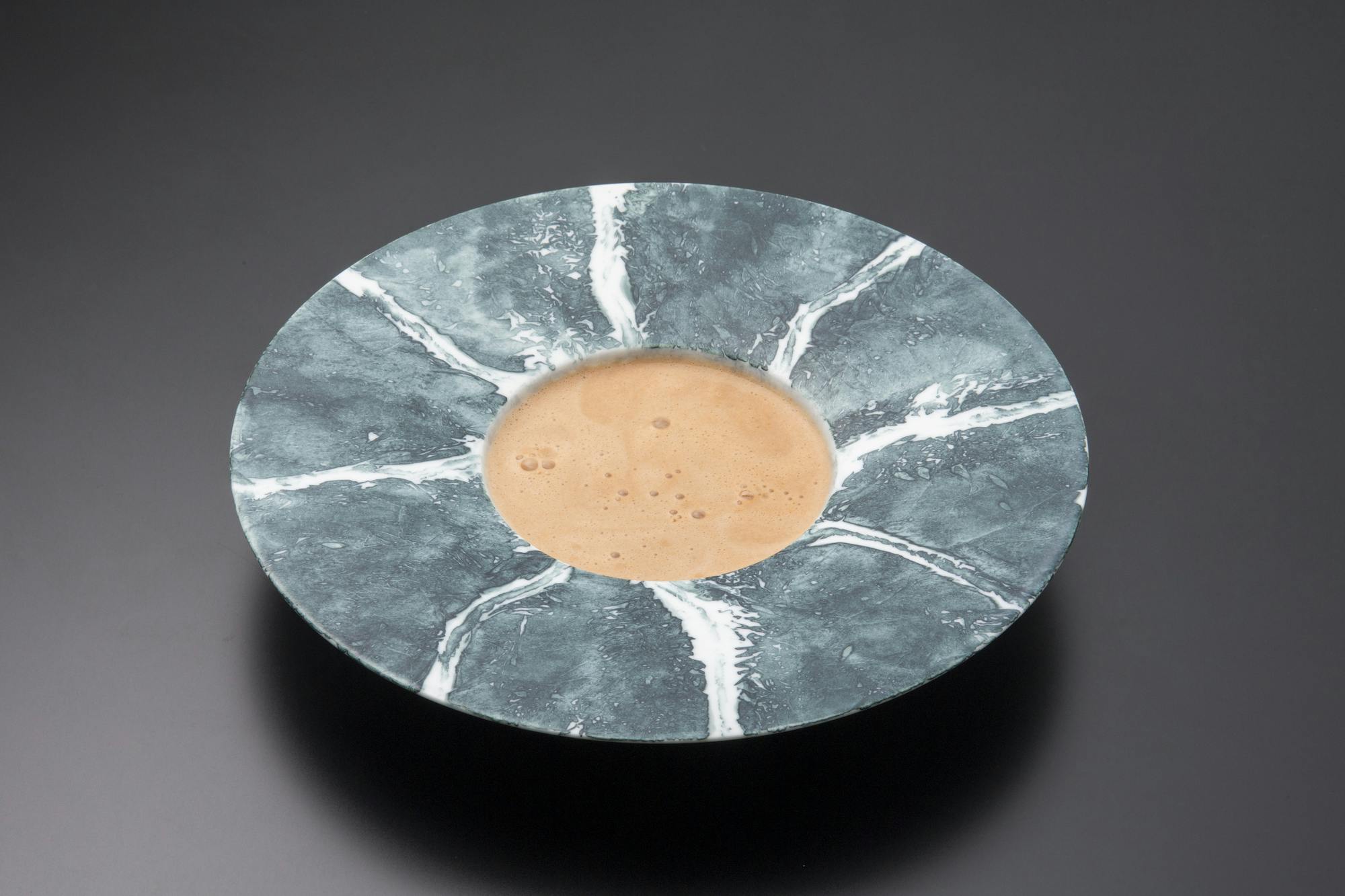 フランス・ブルターニュ産のオマールエビを殻ごとぶつ切りにして、フライパンで焼き付け。丸ごとミキサーにかけます。加えるのは水と塩のみ。香りを生かすために、素材のオマール海老をお客様に見せてから、約5分で仕上げます。短時間で行うことにより香りが最大限に引き出された状態でテーブルに提供します。オマールエビ本来の香りと旨みを味わえる一皿です。
