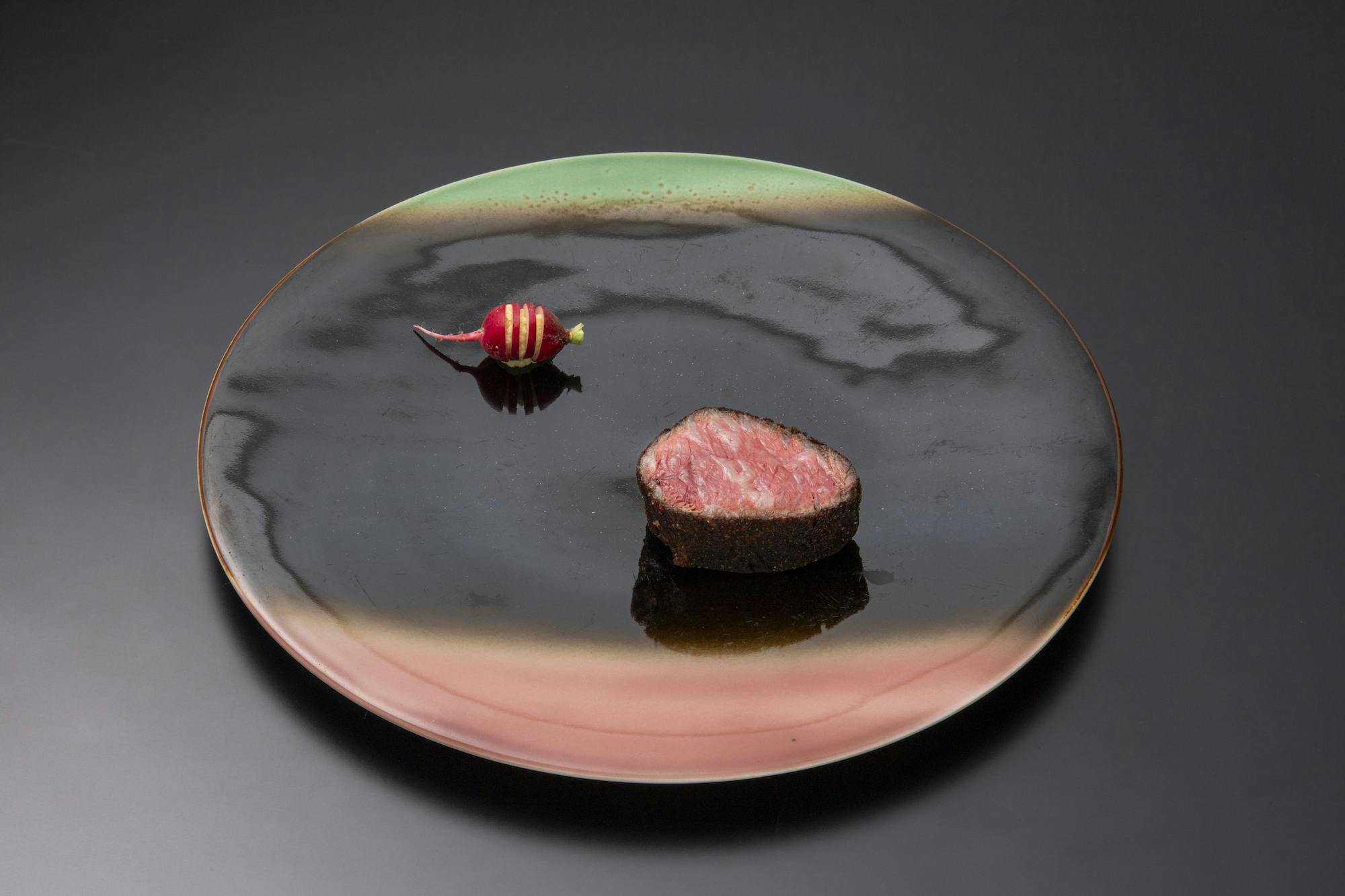 その純血和牛だからこそのバランスのとれた肉質は見事です。水分など余計なものを抜くために、6時間かけて火入れをします。これは、肉に均一に火入れをするための最短の時間です。それにより香りが最大限に残ります。断面が美しく、中心まで高温を保っている肉は、ナイフを入れても肉汁は出ませんが、噛むと肉汁が溢れます。この本来の肉汁をたっぷりと味わっていただきます。
