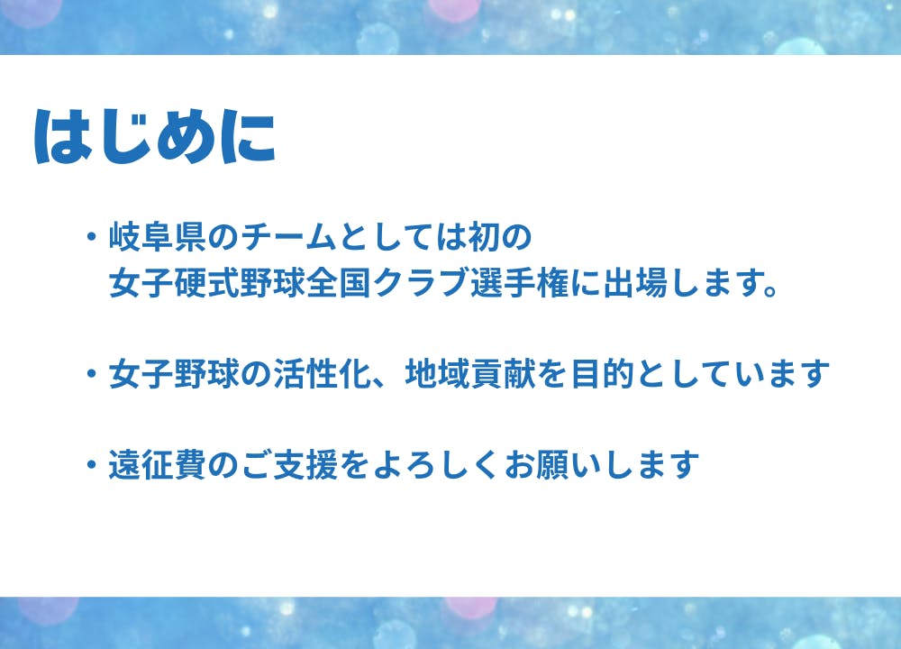 そんな私たちの想いやチーム創設からこれまでの歩みを知っていただき、女子野球の活性化、岐阜県のために奮闘する選手たちが、野球に専念できるような環境を作るべく、ご支援いただければ幸いです。
