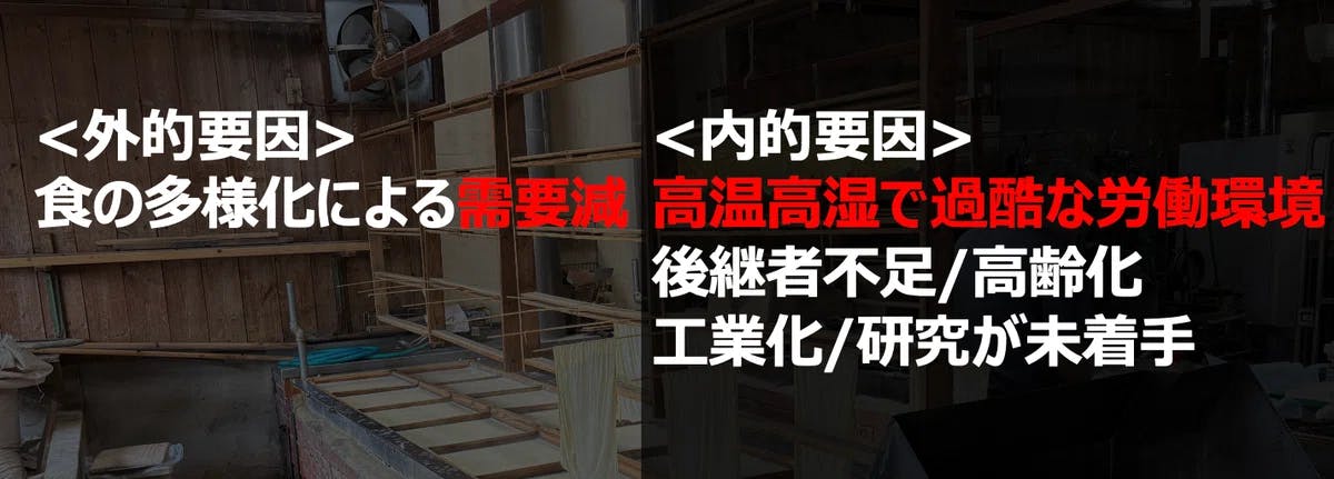 また、業界の内的要因としては、湯葉は豆乳を湯煎して作りますので、高温高湿でまるでサウナのような過酷な労働環境で働く必要があります。(私もサウナ好きですが、あそこで働けと言われるときつい…)そのため労働者不足や後継者不足による職人の高齢化が進んでいます。豆腐作りと同じように工業化が進めば良いのですが、需要が小さい業界にお金は集まりにくく、工業化や研究についてもほとんど進んでいないのが現状です。