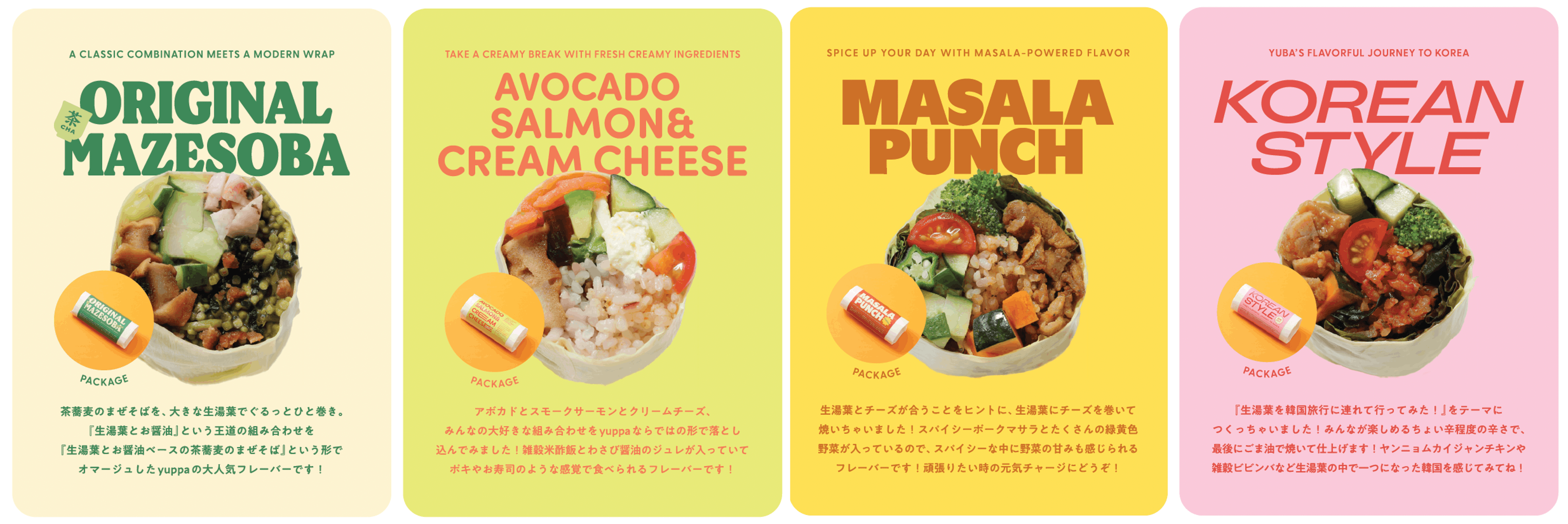 MASALA PUNCH:生湯葉とチーズが合うことをヒントに、生湯葉をチーズで巻いて焼いちゃいました!スパイシーなポークマサラと沢山の緑黄色野菜が入っているので、スパイシーな中に野菜の甘みも感じられるフレーバーです!頑張りたい時の元気チャージにどうぞ!