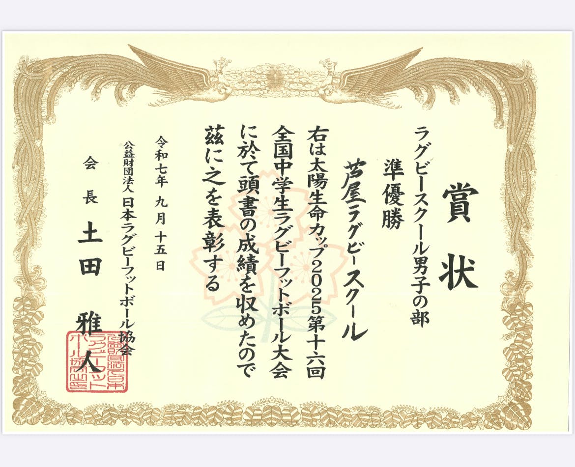 JRFU日本ラグビー協会からの賞状、水戸市からの賞状、準優勝トロフィー、準優勝の盾、フェアプレー賞などたくさんの表彰をしていただき、一同改めて、皆さまのおかげで大きな成果を成しえたんだと感慨深い思いでいっぱいでした。