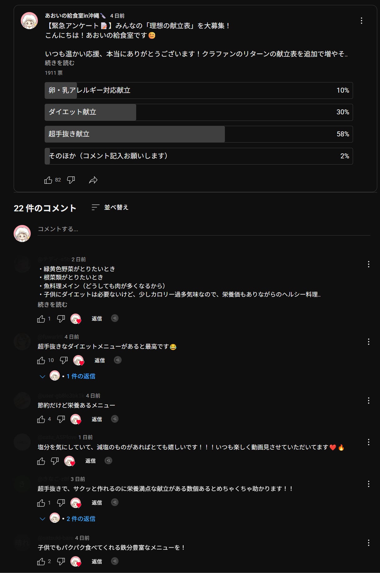 2025/11/15 18:01先日実施しました「朝食に関するアンケート」に、たくさんの方にご協力いただき、本当にありがとうございました!皆様のリアルな声を集計した結果、朝食準備は、〇10分以内で済ませたい〇 調理はしない(作り置きメイン)という、「時短・効率化」への強いご要望が改めて浮き彫りになりました。しかし、その一方で、自由記述で最も多かったのは「とにかく野菜を摂りたい!」という切実な願い。特に「子どもが野菜を食べない」というお悩みが深刻な課題として浮かび上がりました。さらに、「温かいスープ」「子どもが喜ぶ栄養満点レシピ」「洗い物を減らしたい」といったニーズも多く寄せられています。このアンケート結果を踏まえ・・・最初は「献立」という形の提供を考えていましたが「パン1枚で済まる」方もいらっしゃれば「ごはんとおかずを食べる」という方もおられます。カチっとした献立をお渡ししてしまうと、朝から余計な手間を取らせてしまうのではないか?という結論に至りました。きっと私だけでなく、みなさんも「朝からイチから頑張るのは難しい!時間があったら5分でも長く寝ていたい!」ですよね?笑そこで【栄養強化!朝食に+1品レシピ集】を開発することを決定しました!新しいレシピ集のテーマは、「今の朝食に、これ“ちょっと”足したら栄養がグンと上がるよ~!」です!だから、忙しかったり、面倒な時には作らなくてもOK。時間のある時に、いつもの朝ごはんにプラスするだけで、不足しがちな「野菜」と「たんぱく質」を無理なくチャージできるプラス1品栄養レシピ集を開発します!例えば、こんなレシピを鋭意制作中です!【しっかりたんぱく質をチャージ!】栄養UPトーストアレンジレシピ【偏食があるならこれ!】野菜が摂れるかんたん蒸しパン&おやつ風レシピ【手づかみOK!】たんぱく質やミネラルも摂れるおにぎりレシピ【飲むおかず!】野菜たっぷり&体が温まる具だくさんスープレシピ給食レシピの中で、「これなら子どもがよく食べる!」と太鼓判を押せる、子ども受けの良い味付けを中心にまとめる予定です(もちろん大人もおいしい)。朝のひと手間を減らして、家族の健康を守る朝食レシピ集にご期待ください!こちらのレシピ集、当初の予定より大幅に時間をかけて作成しますので「11月中の配布」が「12月中旬の公開」となりますことをご了承いただけましたら幸いです。来週11月22日に、献立コース、リターン、エプロン会員など詳細を、それぞれメールにご連絡させていただきます。進捗状況は、またこちらで随時ご報告していきますね! もっと見る