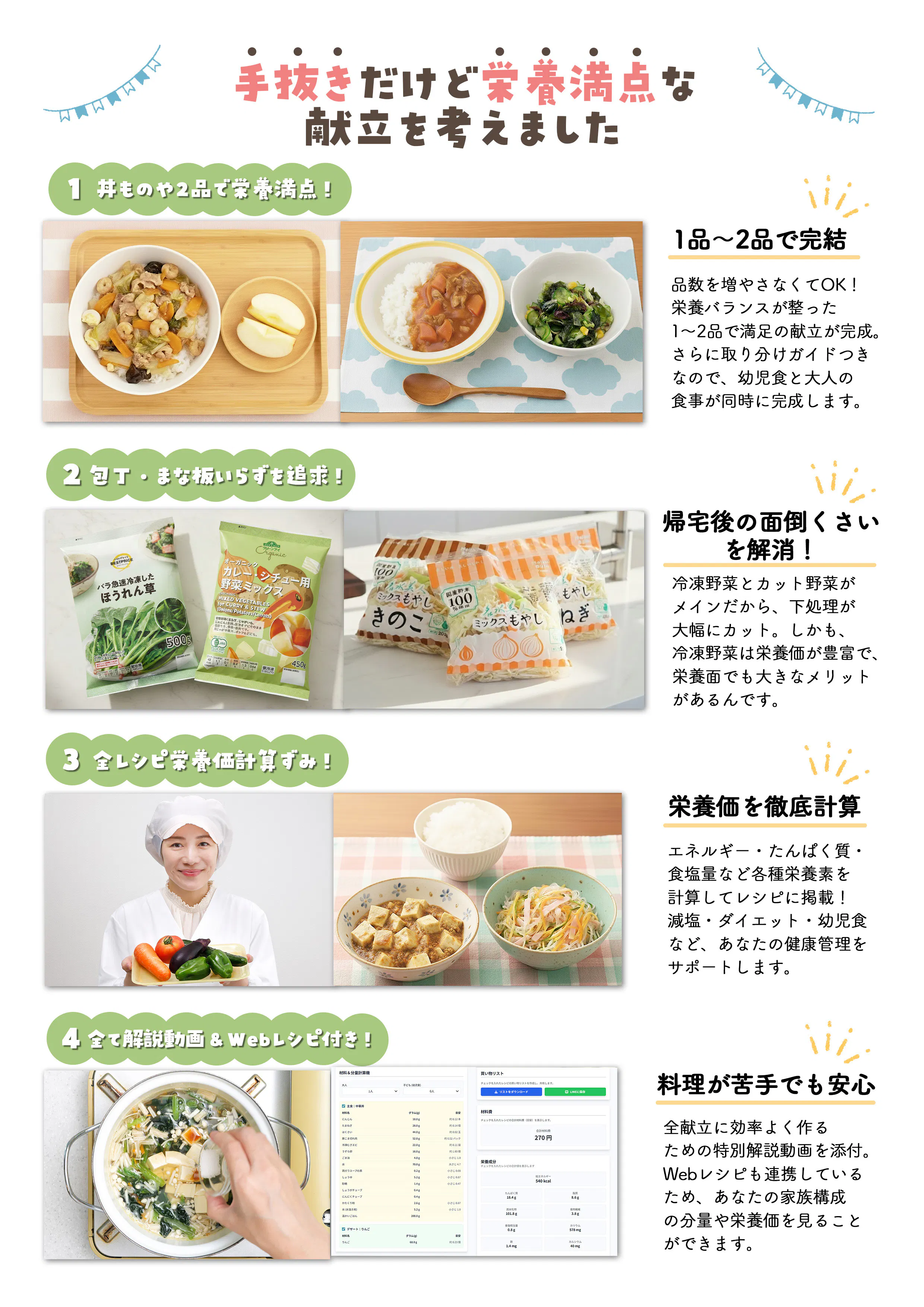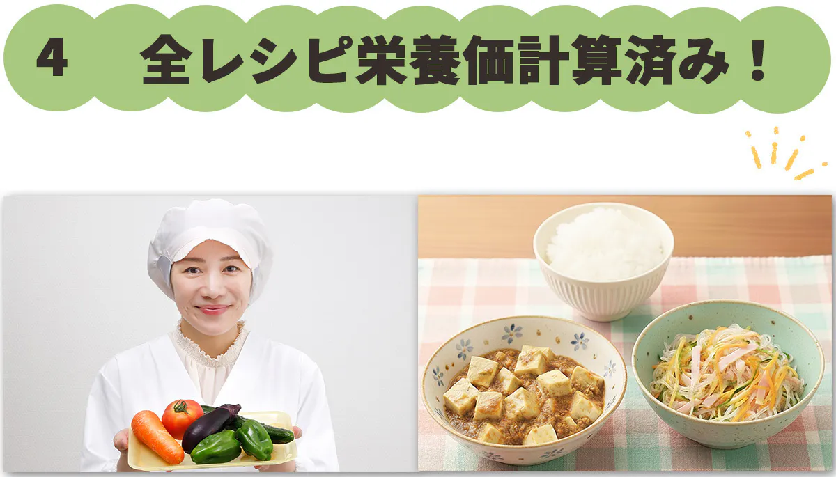 そんな不安を解消するために、全献立とレシピは栄養価計算をしてお届けします。