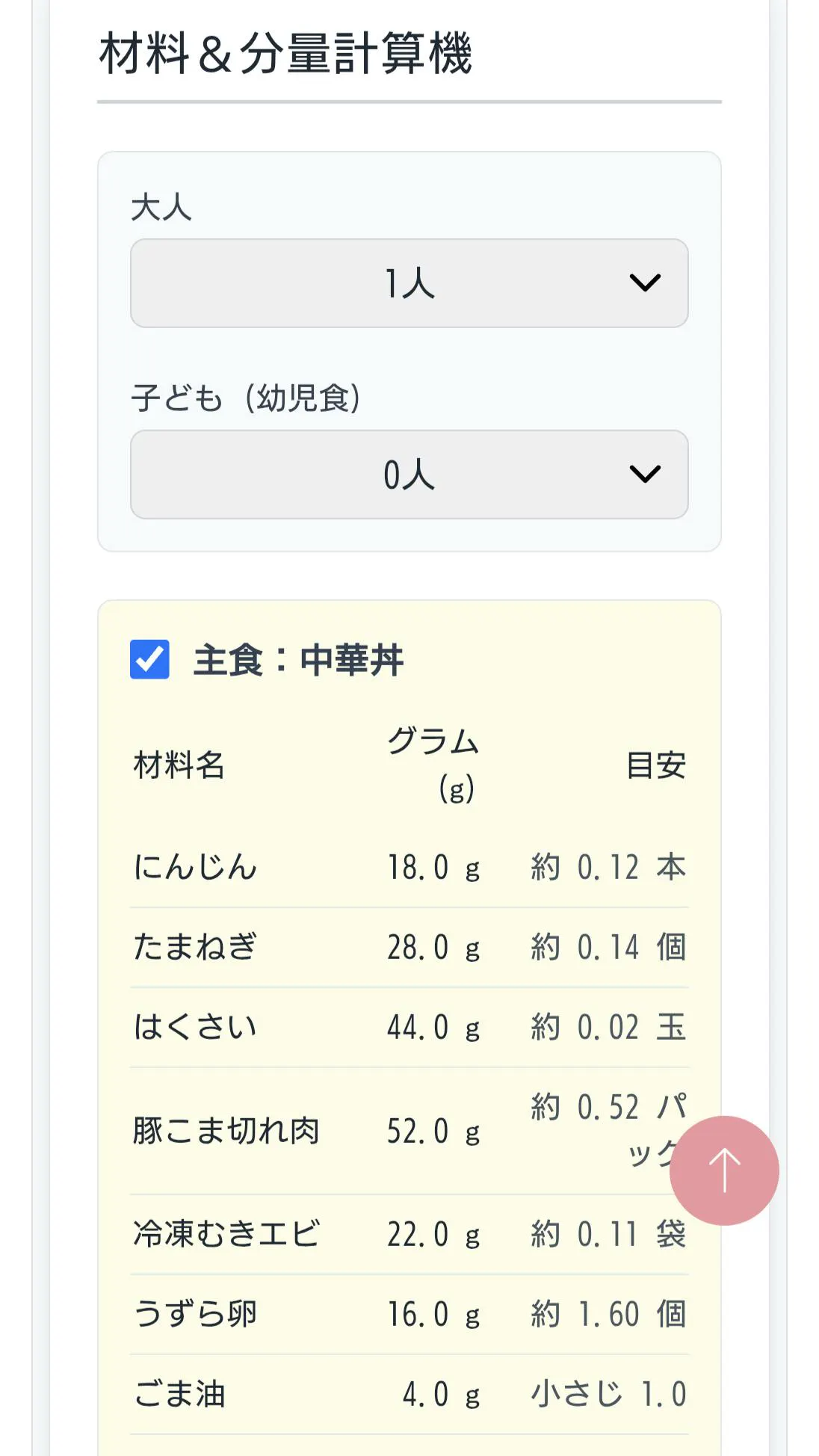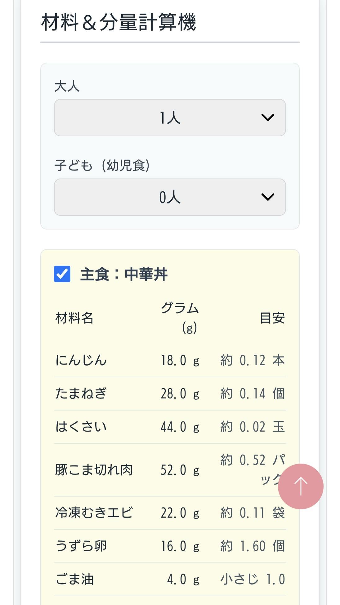 ご家族の人数をセットすれば、必要な材料がパッと表示されます。