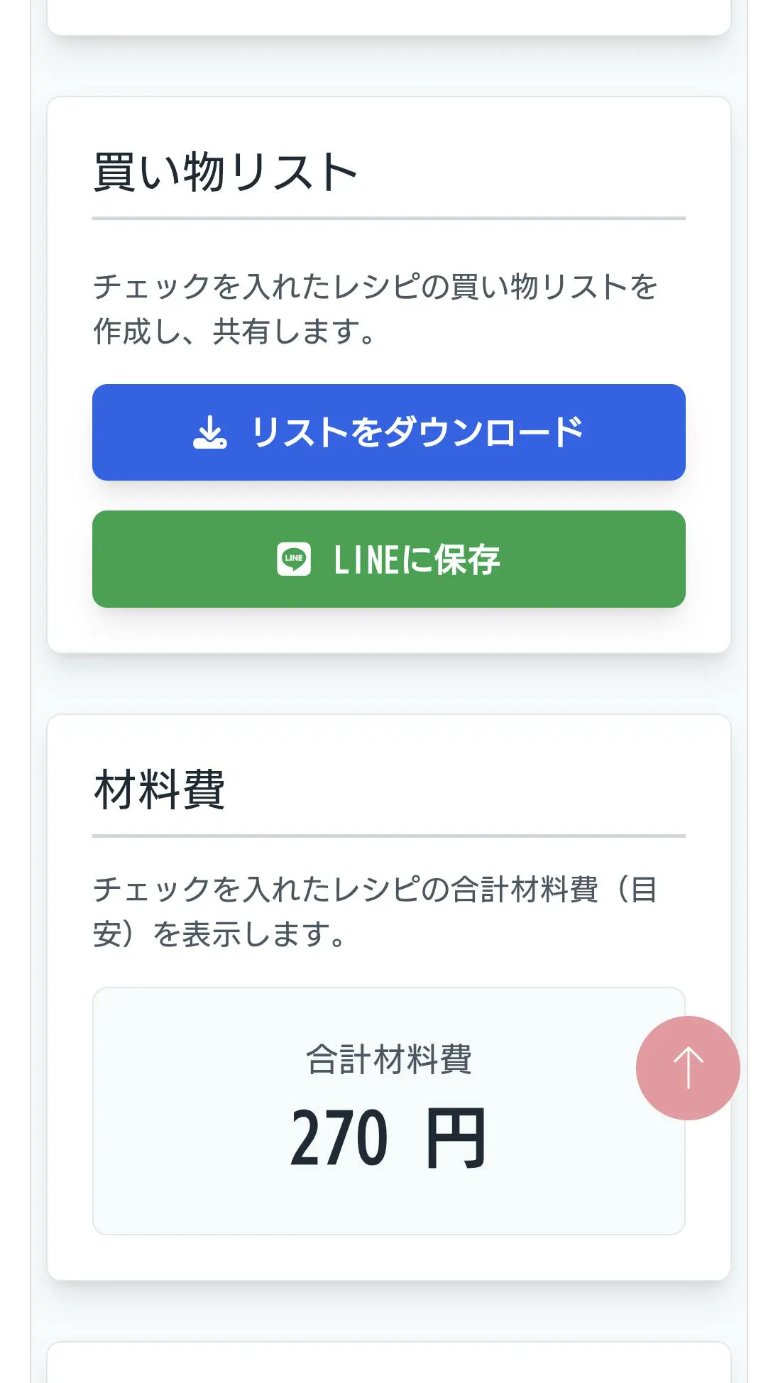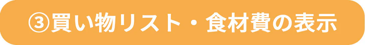 必要な材料をテキストやLINEメモにダウンロードしたり、入力人数に連動して目安食材費が表示されます。