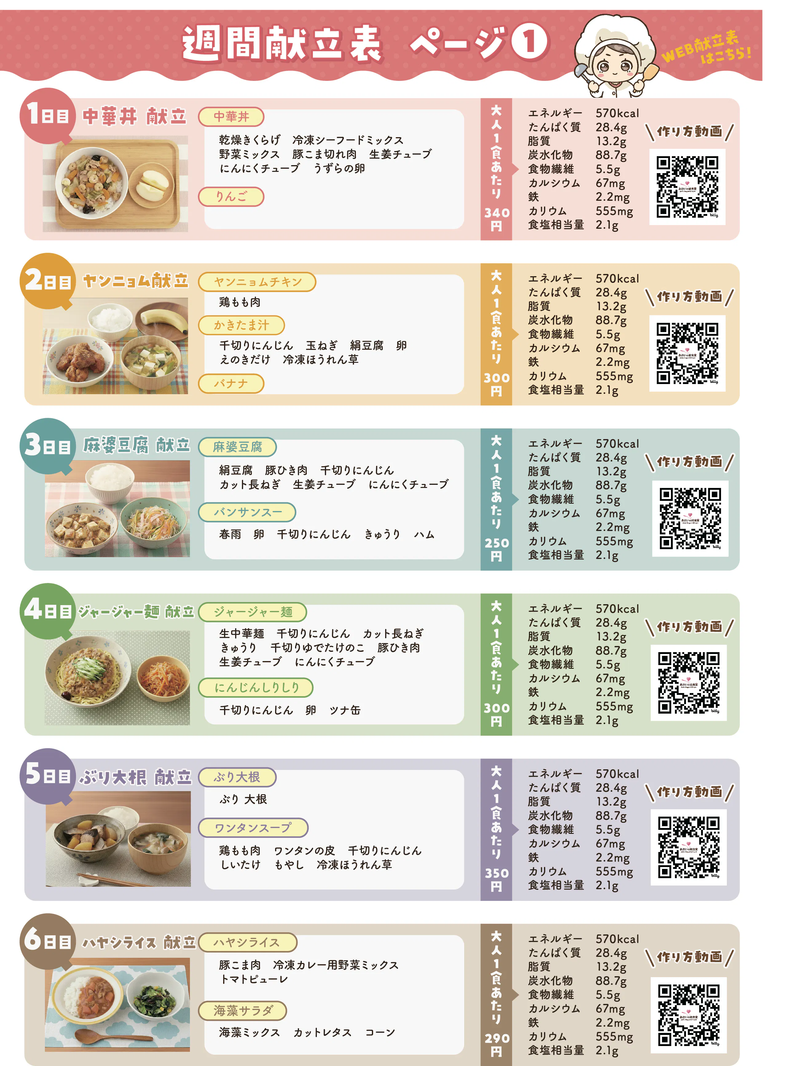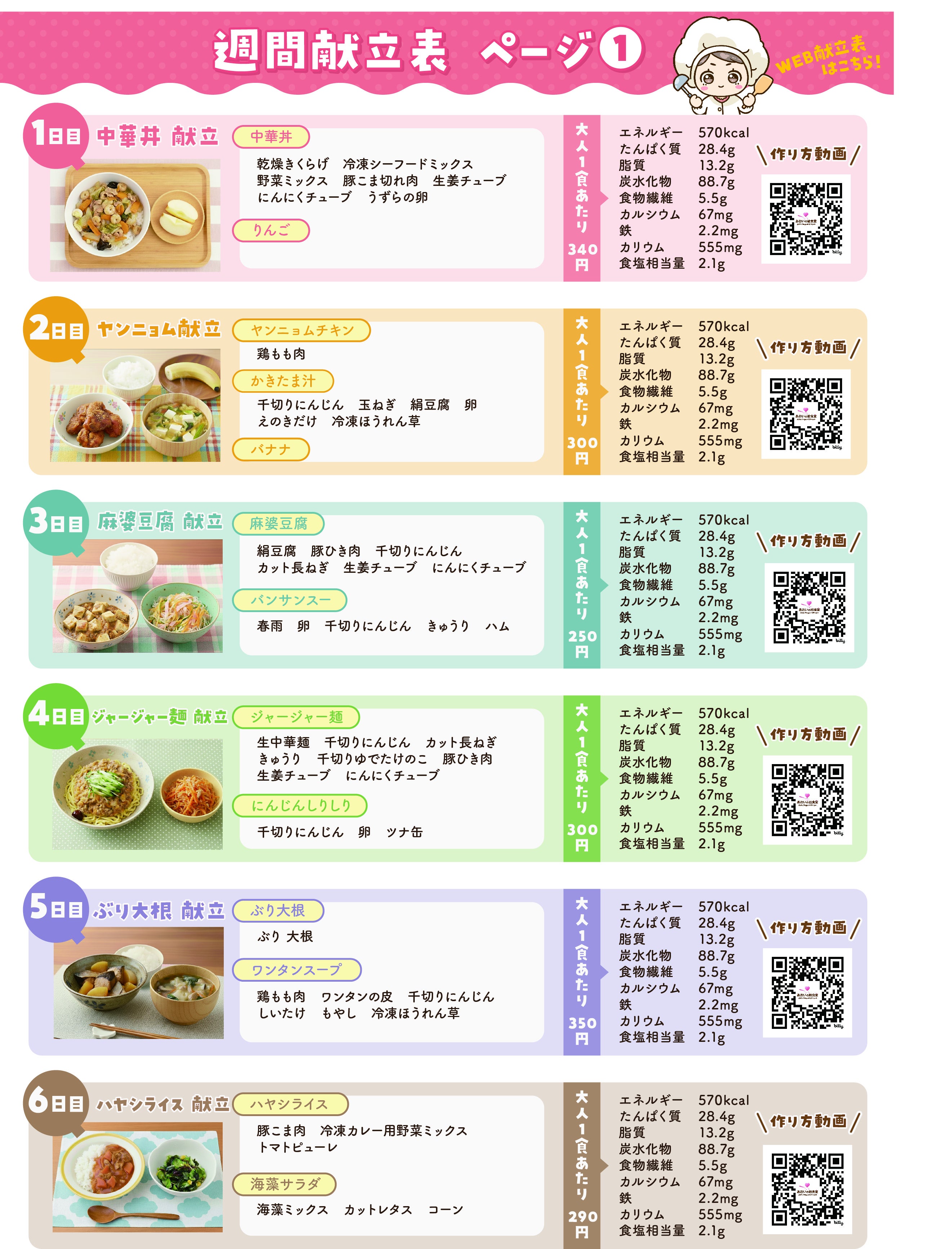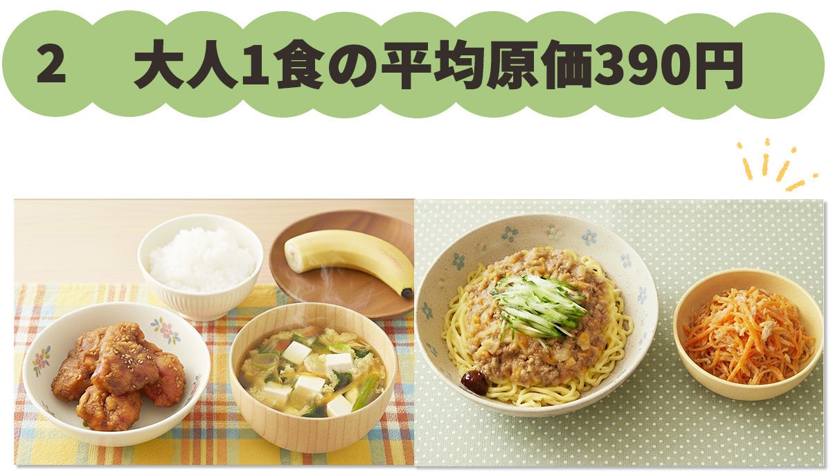 この献立表は、なんと大人1食の平均原材料費が390円になるよう設計されています。