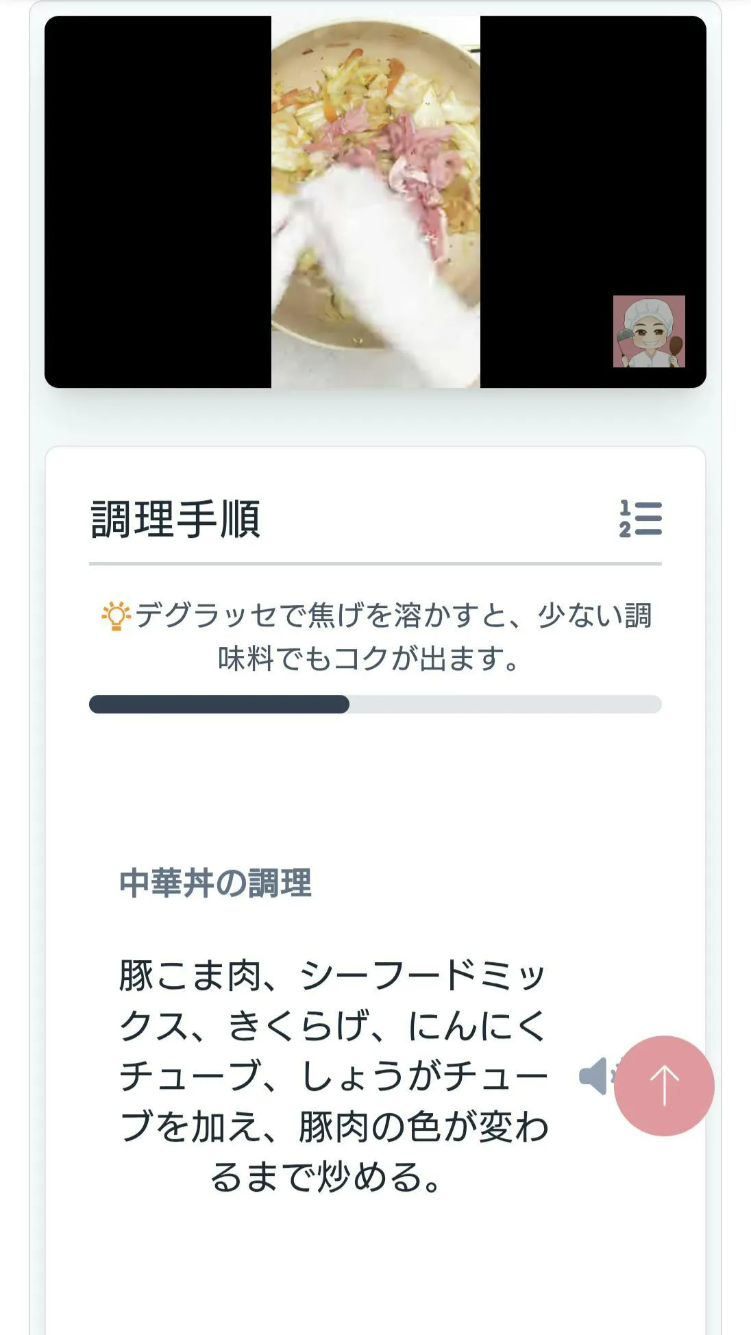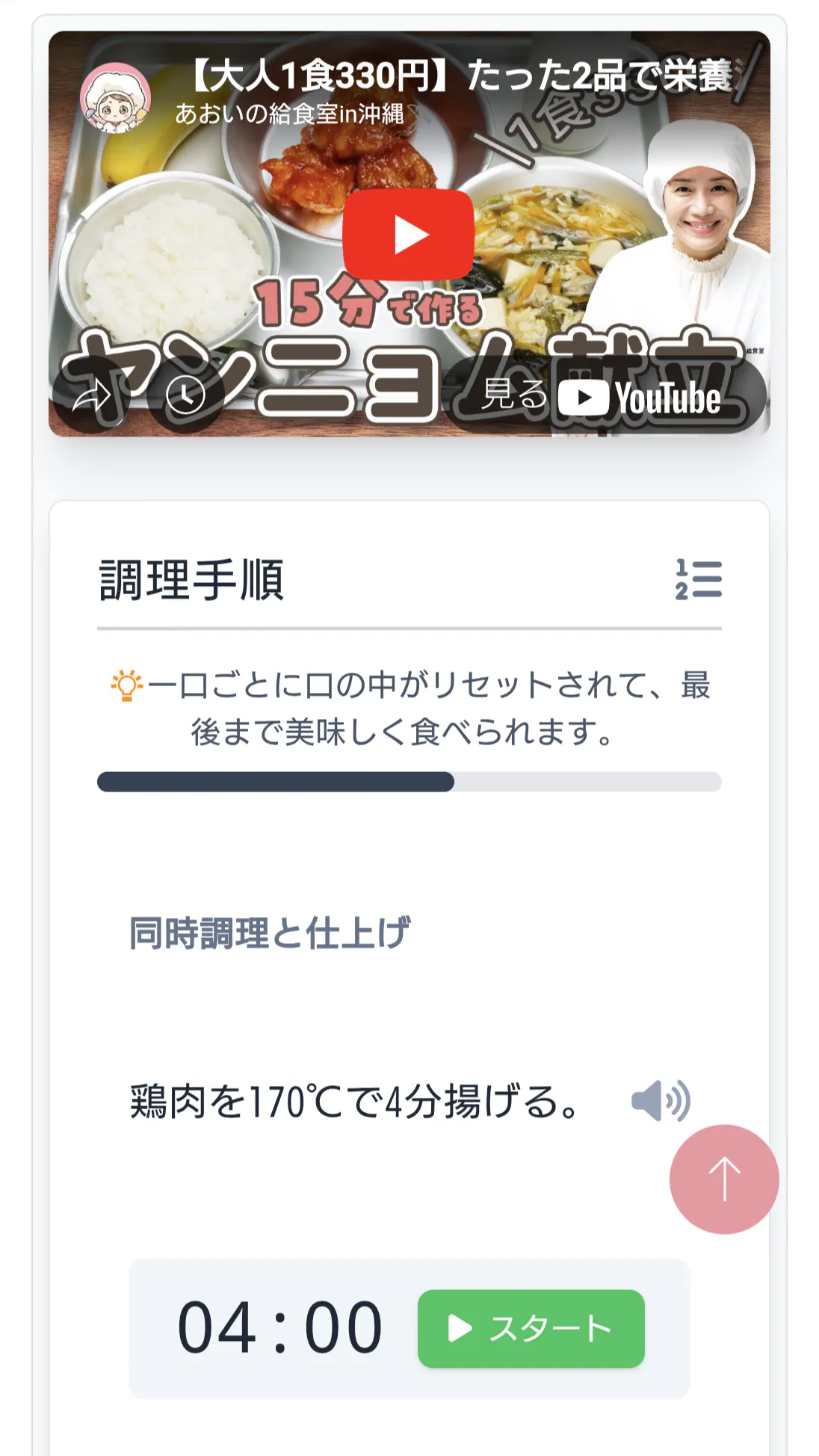 動画と調理手順が連動して動きます。タイマー機能も埋め込まれています。