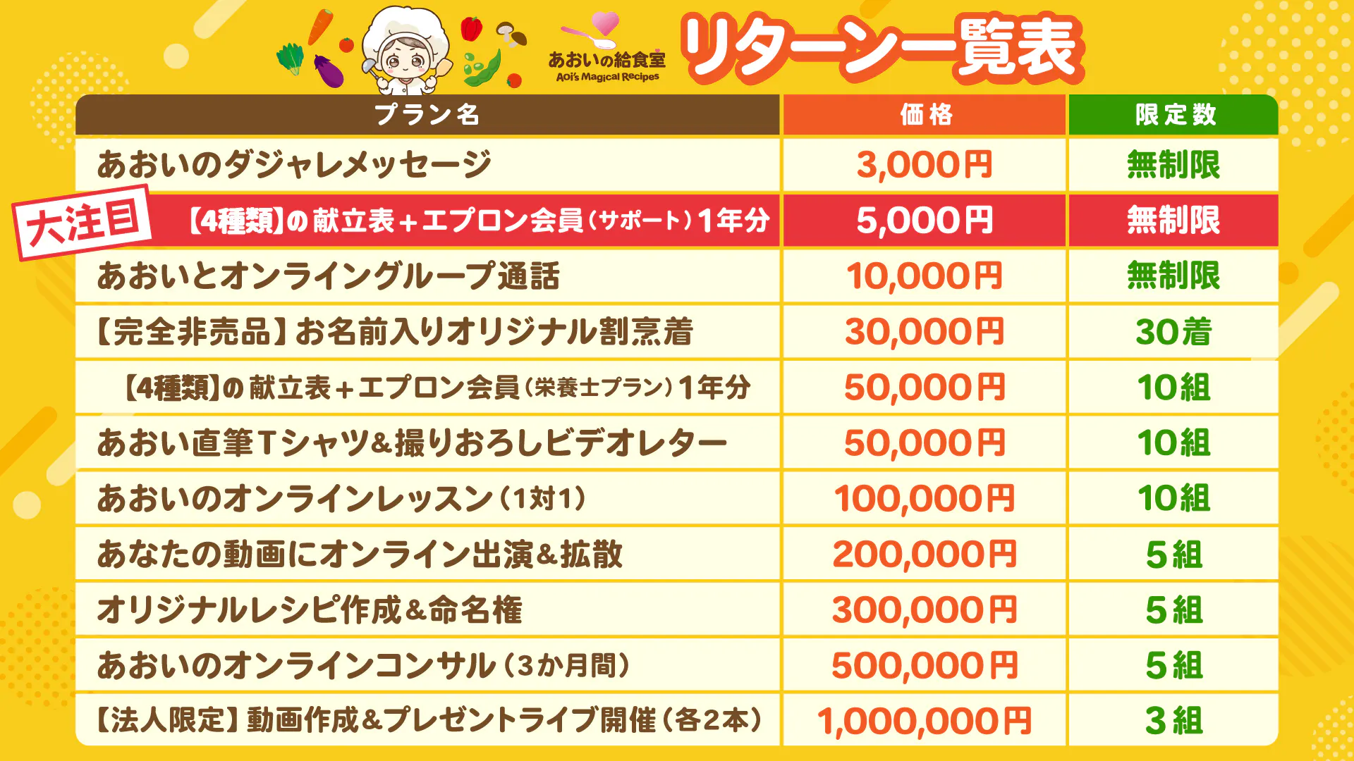 リターン(プラン)は、献立表だけではありません。