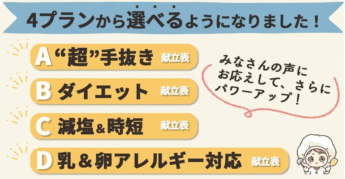 選べる4タイプの献立で、みなさんのお悩みを解決します。