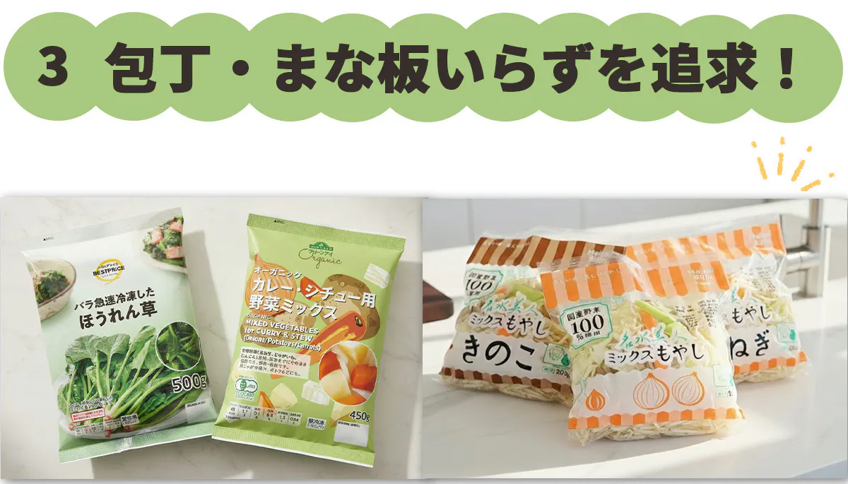 冷凍野菜とカット野菜メインで作れるようにして、下処理を大幅にカット。