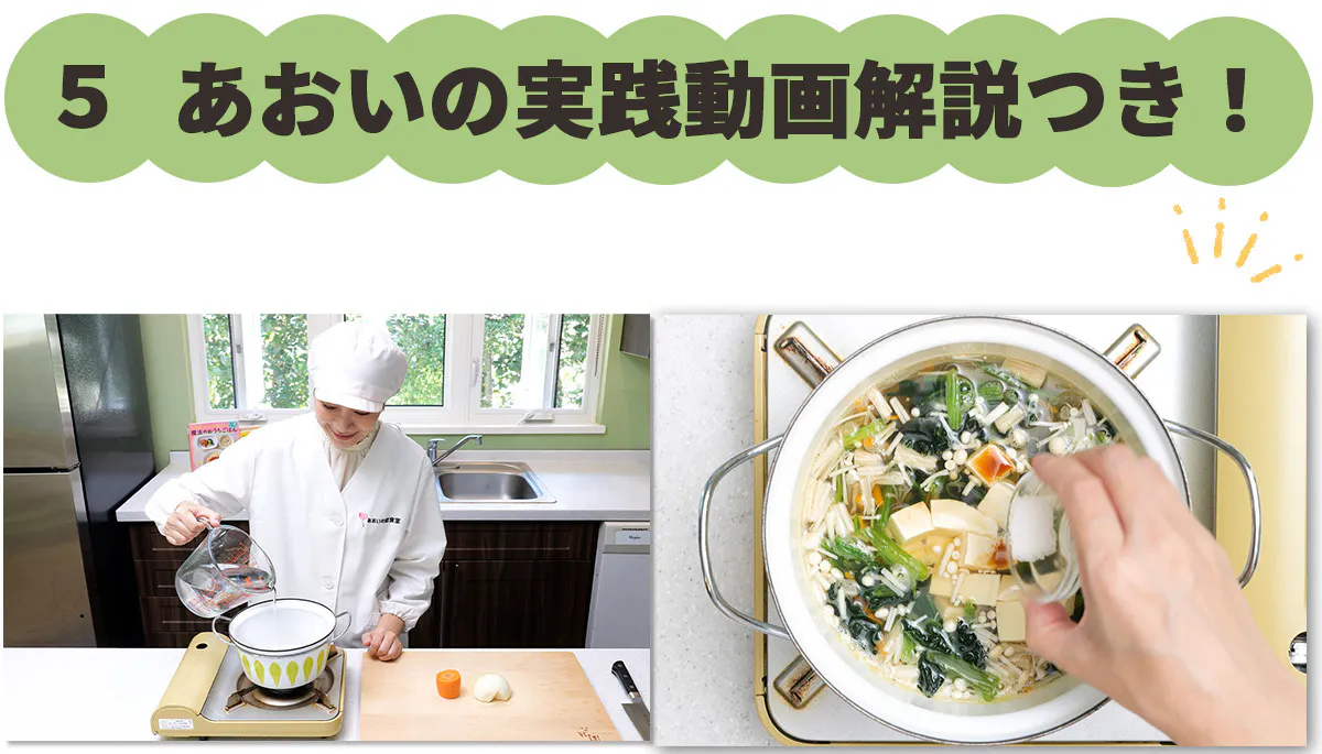 あおいが実際に調理している手元動画を、解説付きですべて収録。