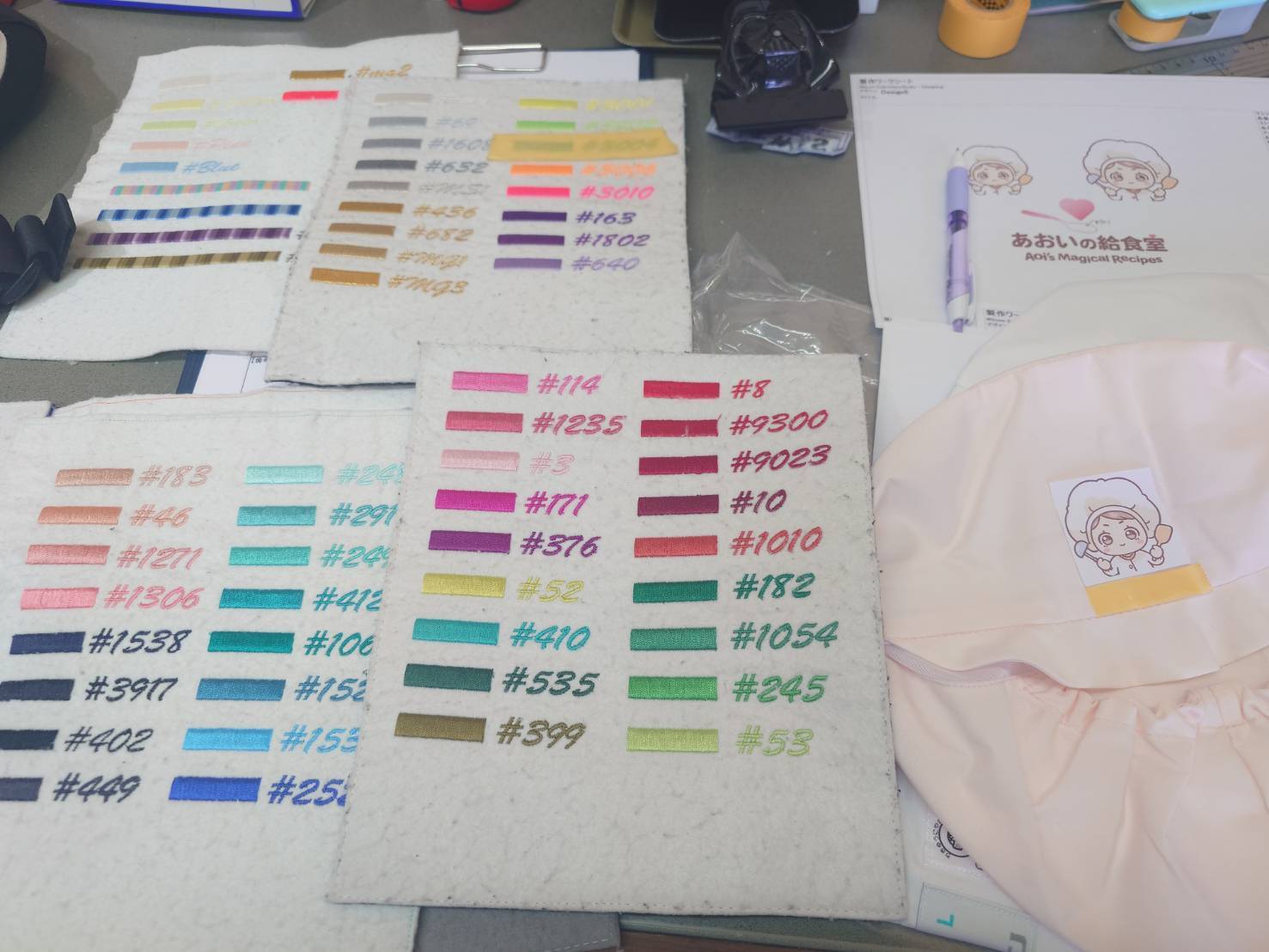 ご覧ください、このたくさんの刺繍の色を! 皆様に心から喜んでいただける一着をお届けできるよう、一つひとつ色を選んだり、ワッペンの位置を調整したりと、細部までこだわって製作を進めています。