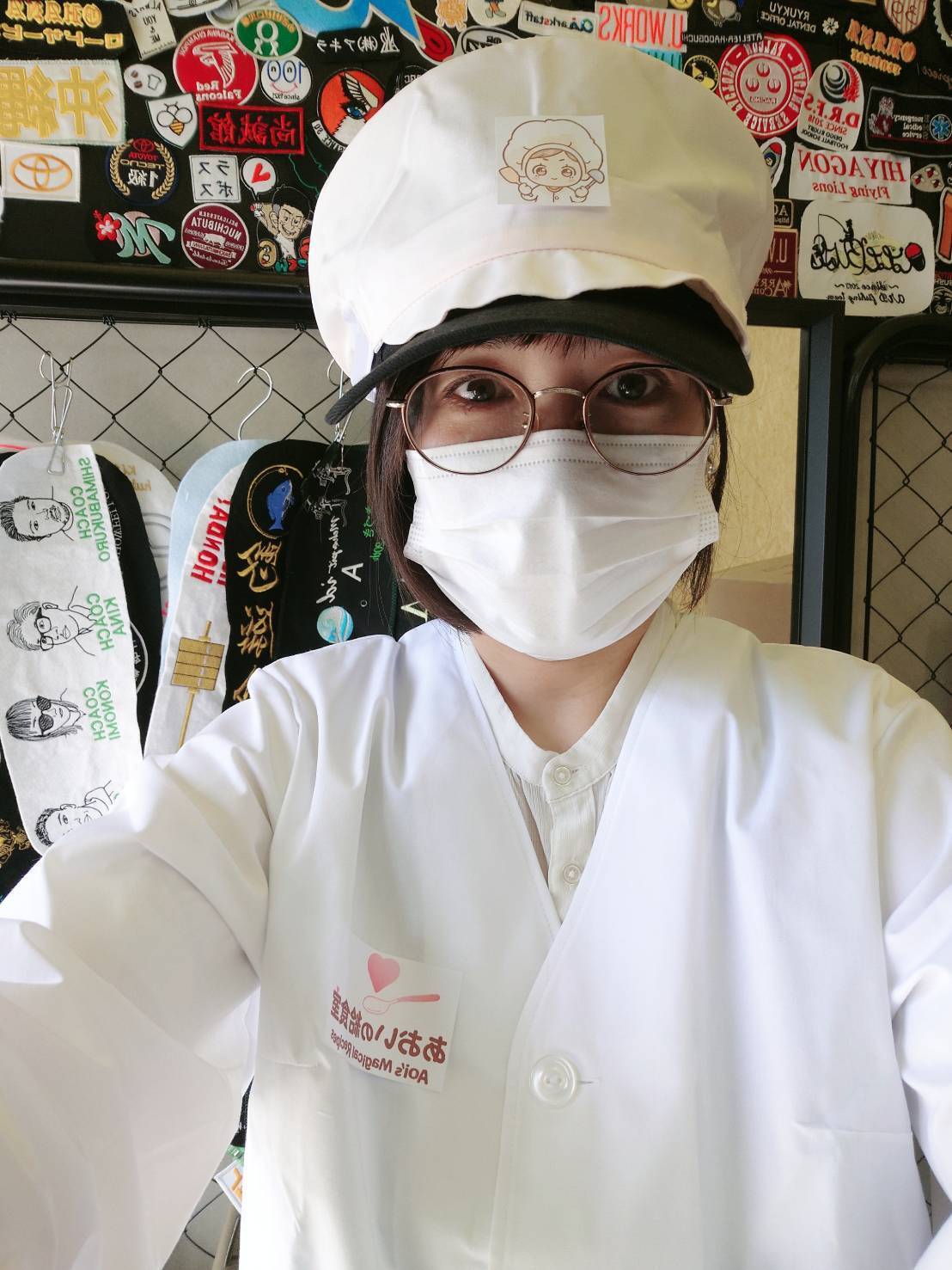 本日は、リターン品である「あおいの給食室オリジナル割烹着」の製作のため、工場へお邪魔してきました。 こうして白衣に袖を通すと、気持ちが引き締まりますね!