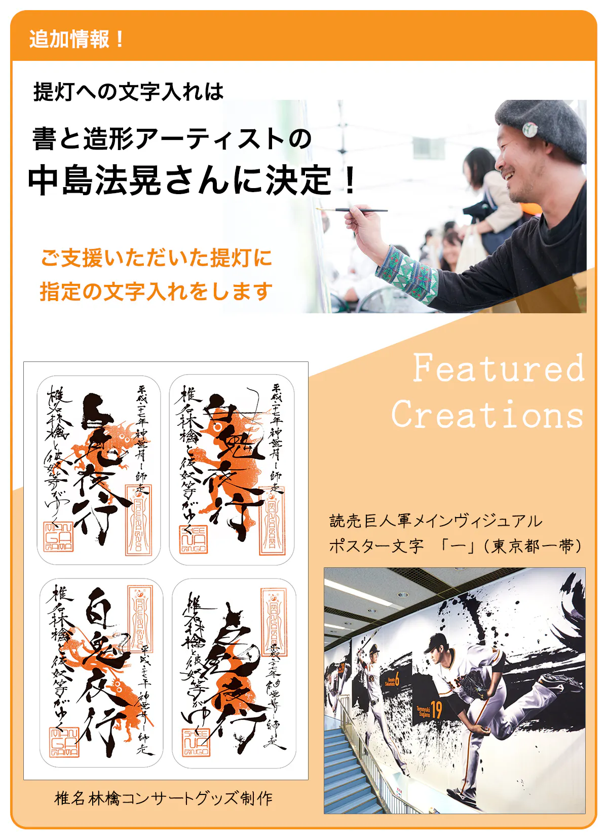 また、提灯に文字入れは、書と造形アーティストの中島法晃さんに決定しました!