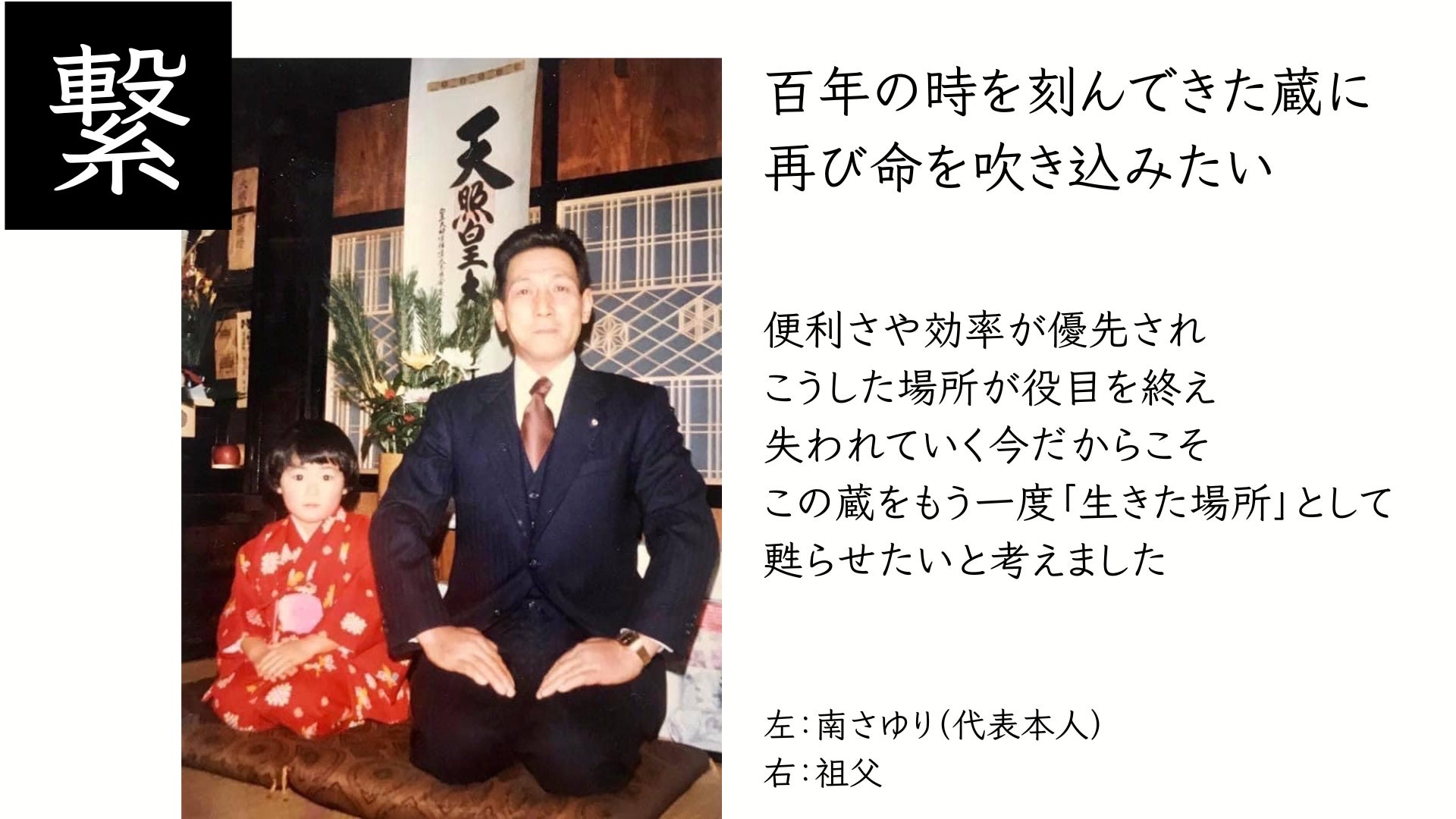 かつてこの蔵は、家族と暮らしを守るための場所でした。そしてこれからは、ものづくりを通して、人と環境、文化を未来へつなぐ場所として再び息を吹き返して欲しい。この蔵に込めた「守る」という意思を、現代においては「未来へつなぐ」という形で受け取りたい。五代目である私の手によって、再び未来へ向かって動き出します。