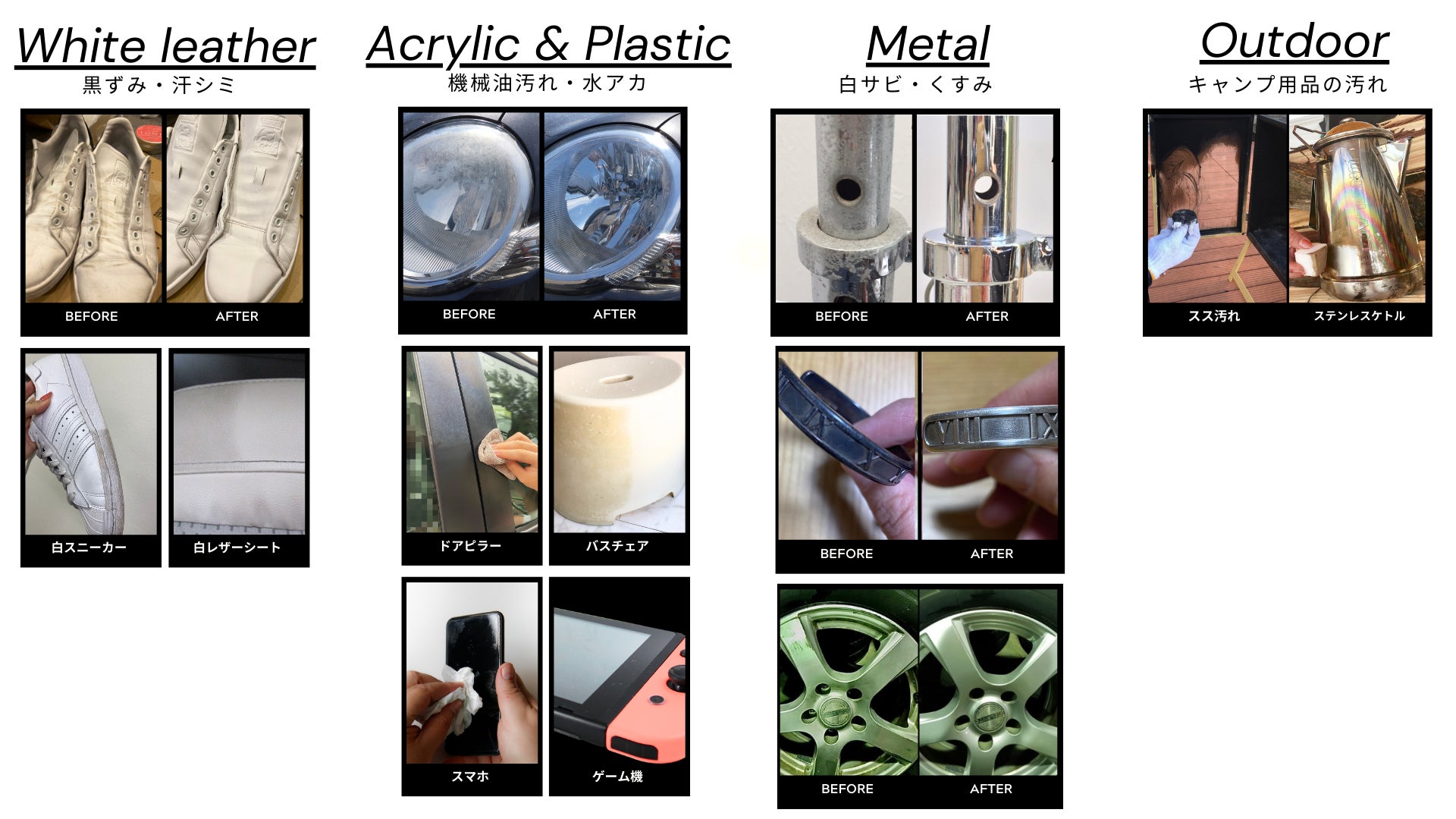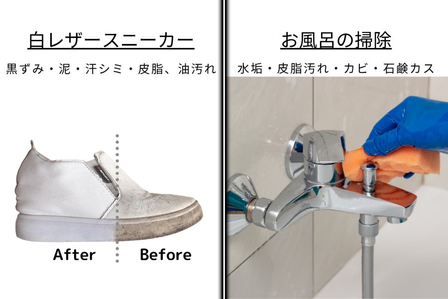 お風呂・スニーカーなど、さまざまな汚れに対応する万能クリーナー。水なし・泡なし、つけて拭くだけ。水アカ、油汚れ、くすみ、黒ずみ、これ一つで「掃除」と「ツヤ出し」が同時にできるバーム状のお掃除ワックスクリーナーです!